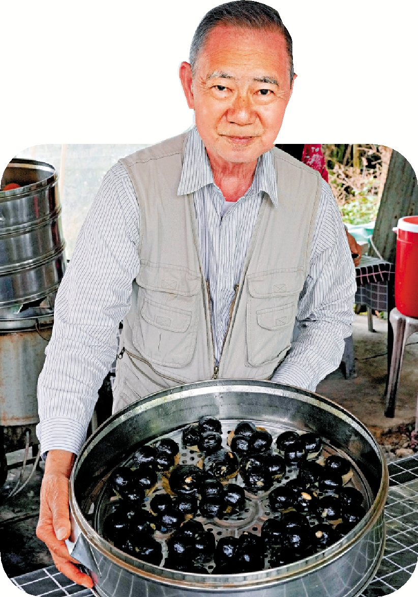 新鮮出爐的雞屎藤茶粿,每一粒表皮呈現透亮的黑色,好像難以與碧綠的雞屎藤聯想在一起,但通過熱氣又能聞到陣陣青草香氣,令人胃口大開。偉強叔說,雞屎藤在加熱後會由綠色轉為灰黑色,也並非會有人們懷疑的雞屎味,而是草藥味。