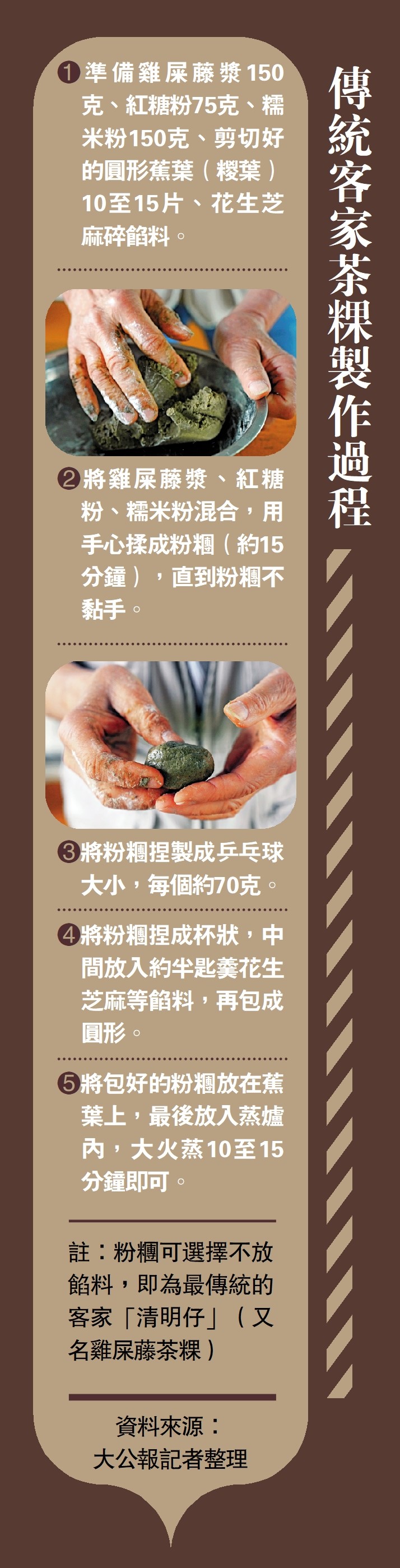 (大公報記者 王亞毛、黃洋港)清明時節,正是雞屎藤草的盛產期,勤勞的客家人運用智慧,將這些豐茂的植物收割,搗爛後與糯米粉及紅糖粉混合,製成茶粿,成為客家傳統的清明祭品「清明仔」,也讓遊子返鄉團聚。在西貢鹽田梓的客家村,仍有一家店堅持製作傳統茶粿。