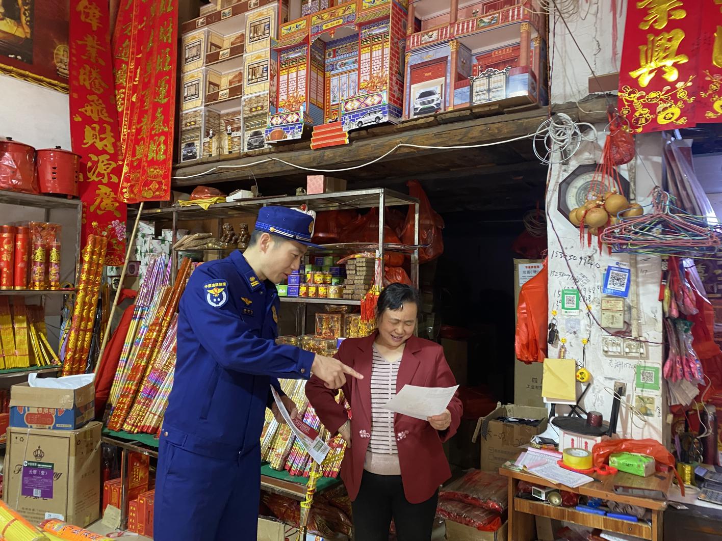 韶關市消防救援支隊的消防人員深入各大街小巷,重點對祭祀用品銷售店舖貨物堆積雜亂、滅火器過期、電氣線路私拉亂接、老化破損等方面進行全面的指導服務。消防人員還現場向商家普及電氣安全、用火安全等消防知識,強調清明期間祭祀用品易燃的特點,提醒商家嚴格落實消防安全主體責任。