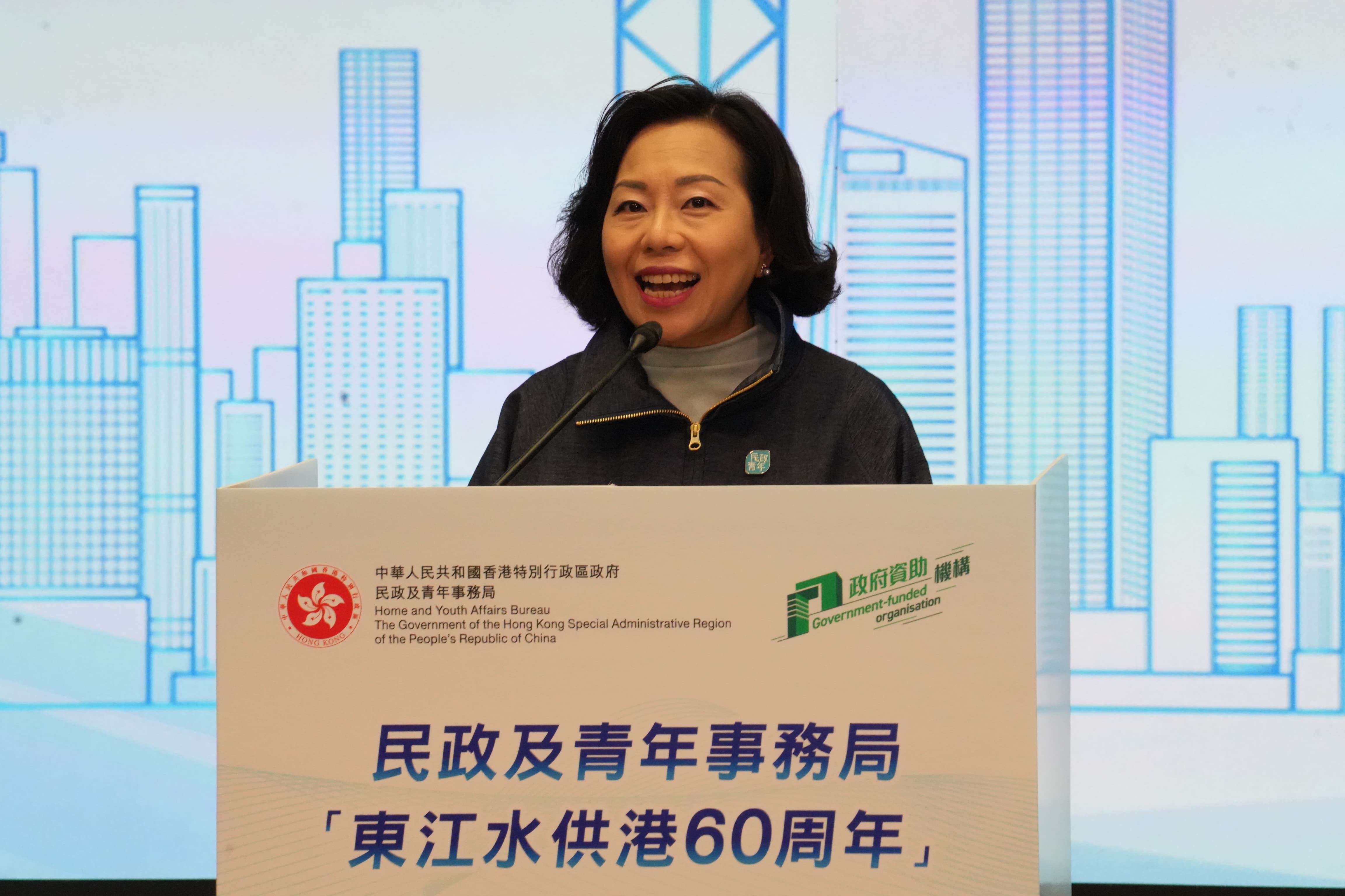 麥美娟在致辭中表示,六十年前,東江水穿山越嶺注入香江,解決了困擾香港多年的水荒問題。此後,國家三度擴建升級供水系統,現今東江水供港水量佔香港淡水供應的七成以上,每一滴水都承載着超越半世紀的家國深情。