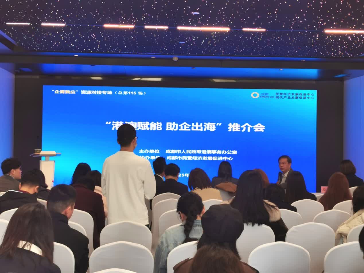 在全球化浪潮中,企業「出海」已成為尋求突破與發展的關鍵路徑。為助力成都企業順利「出海」,在「蓉匯港澳 聚力同行」主題框架下,成都市政府港澳辦聯合成都市民營經濟發展促進中心舉辦了今次推介會,積極搭建政企溝通橋樑,吸引了來自40餘家企業的代表參加。