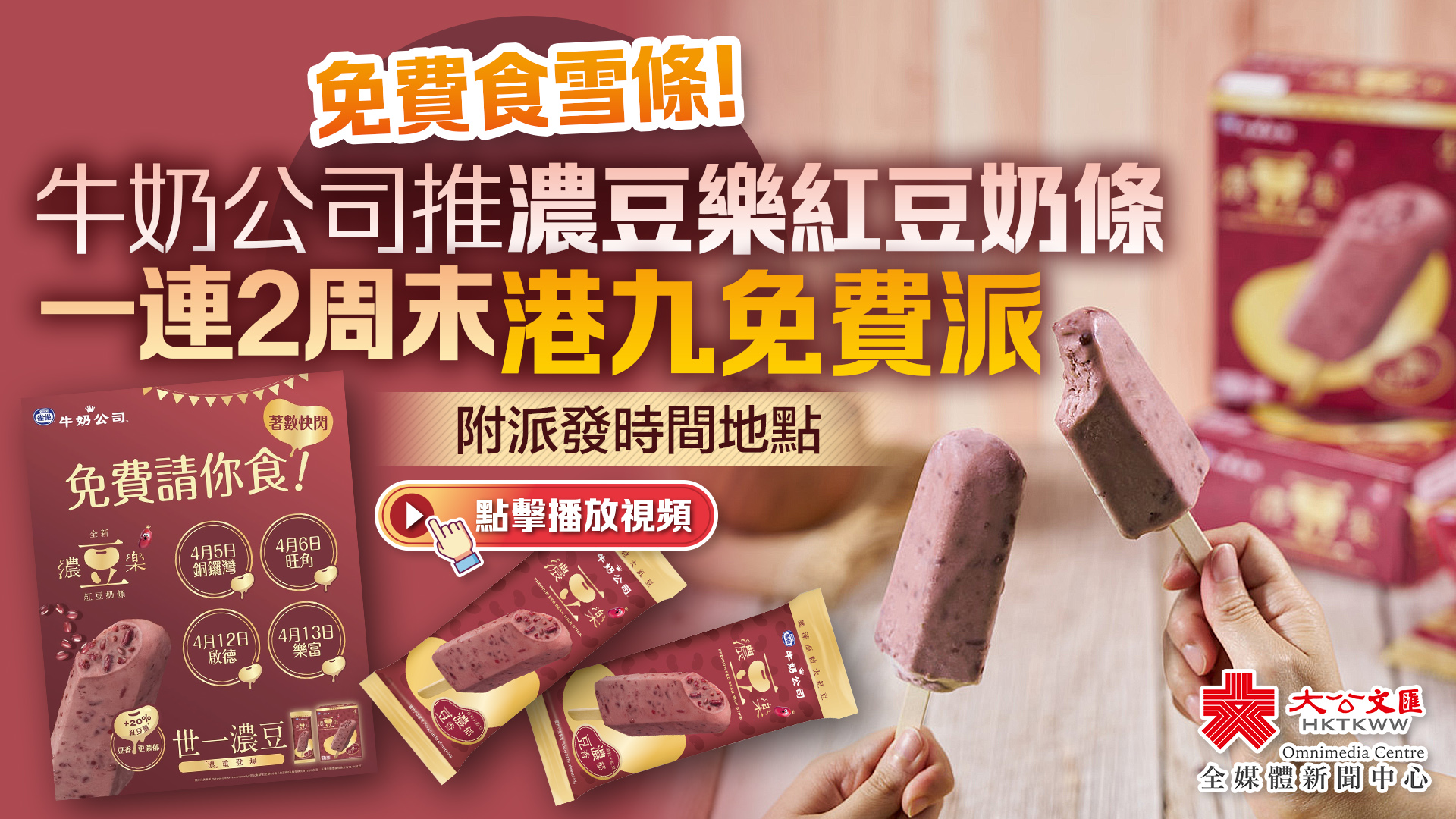 大公文匯全媒體報道,雀巢牛奶公司近日宣布推出升級版「濃豆樂紅豆奶條」,新版雪條加埋原粒大紅豆,與舊版相比紅豆量增足20%!為慶祝新雪條面世,牛奶公司會於今個星期起一連兩個周末,於港九舉辦快閃免費派雪條活動,住係附近或者啱啱好路過嘅市民一定唔好錯過!