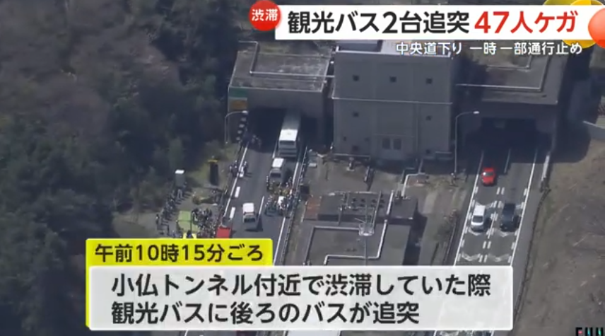 據日媒NHK報道稱,兩輛巴士今日(5日)在東京八王子中央自動車道小佛隧道入口附近發生碰撞,據東京警視廳透露,事故造成47名乘客等受傷。