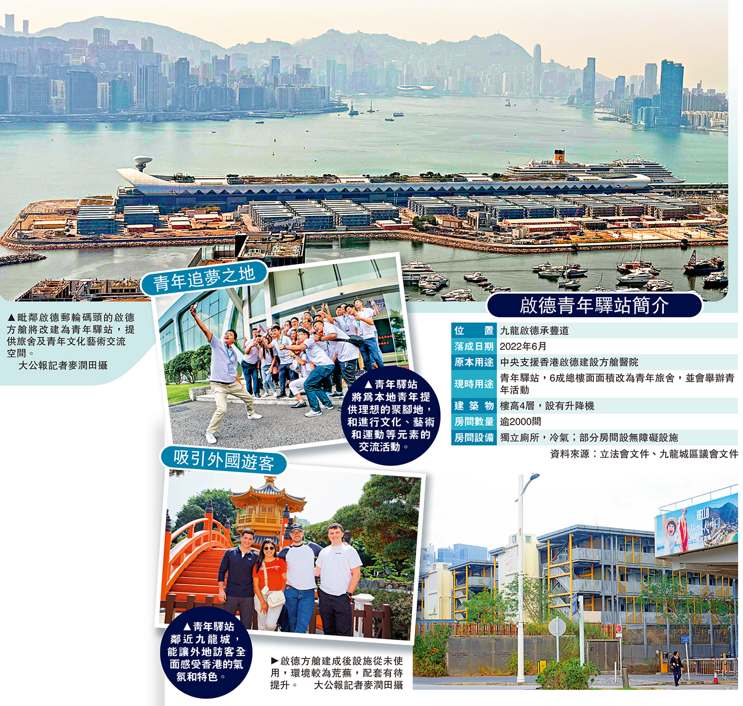 「青年驛站」毗鄰啟德郵輪碼頭,擁有維港海景,同區的啟德體育園旁邊就是啟德帝盛酒店。「青年驛站」前身是啟德社區隔離設施,於2022年第五波疫情期間以組裝合成法(MiC)興建,採用鋼結構,設有升降機、電訊網絡設備等。