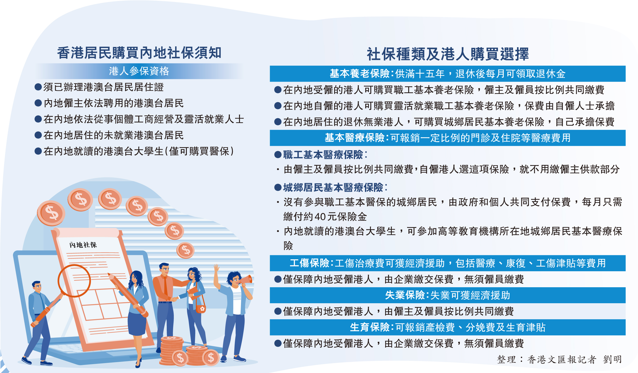 至去年底已有30萬人次港澳居民購買內地社保,有3.55萬人享受待遇,購買社保人數對比2019年底增長近一倍。隨着愈來愈多港人到大灣區內地城市工作及退休養老,工聯會立法會議員黃國相信,購買內地社保的養老保險和醫療保險的港人亦會趨增,直言養老保險在退休後可每月領取退休金,且內地政府有補貼,較會出現虧損並一筆過領取的強積金有更多保障,而內地醫保的保障範圍亦遠較香港為佳。