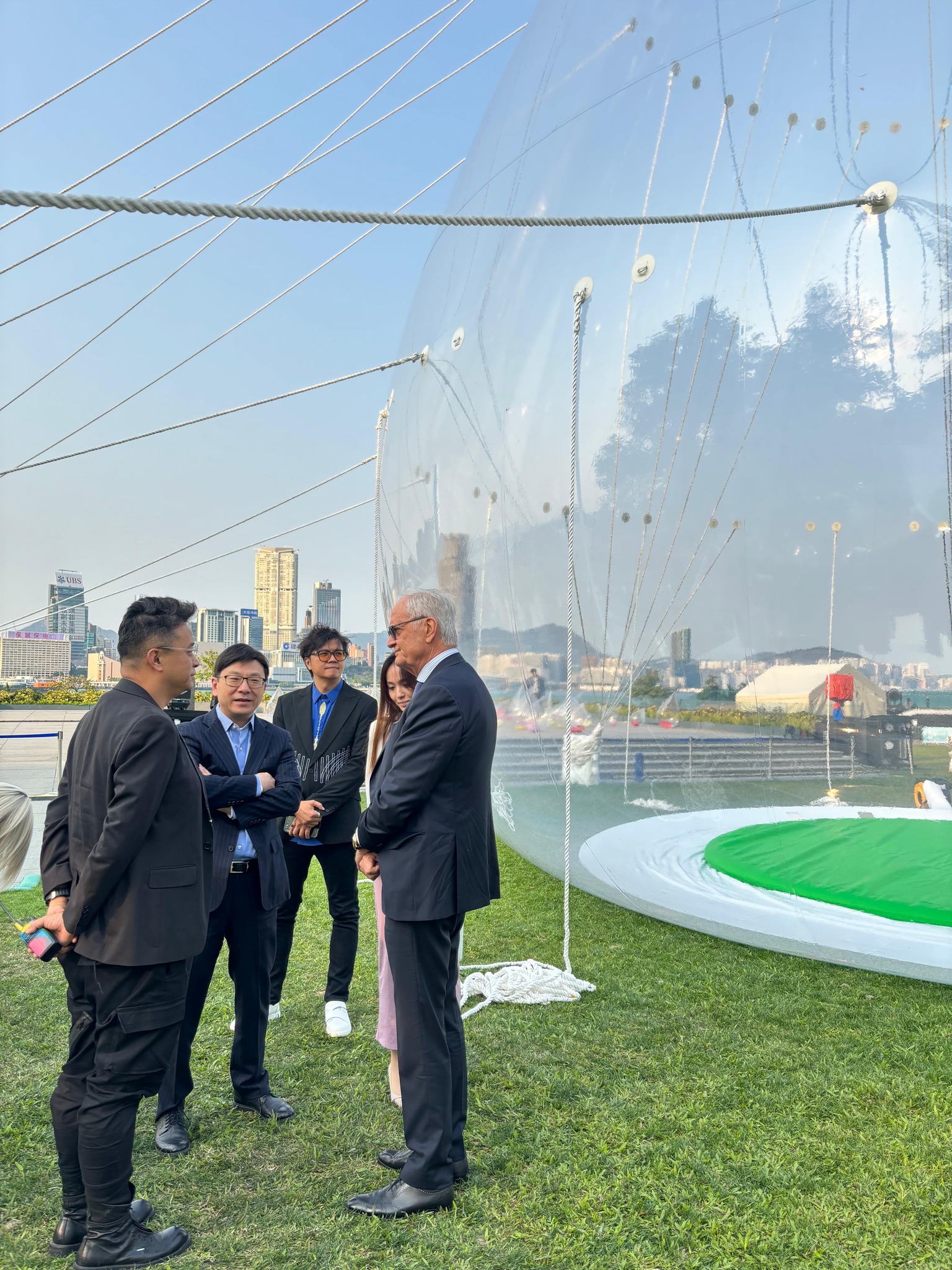 勞工及福利局局長孫玉菡指,日前聯同副局長何啟明和政助傅曉琳,相約「水滴展」創作者、國際著名藝術家馬興文Simon,一同到添馬公園相聚參觀,期間更巧遇諾貝爾家族成員、現任諾貝爾可持續發展基金會主席Peter Nobel,以及知名作曲家及音樂製作人林健華Joanus,大家一同欣賞裝置並聽取Simon介紹其匠心獨運的創作理念。
