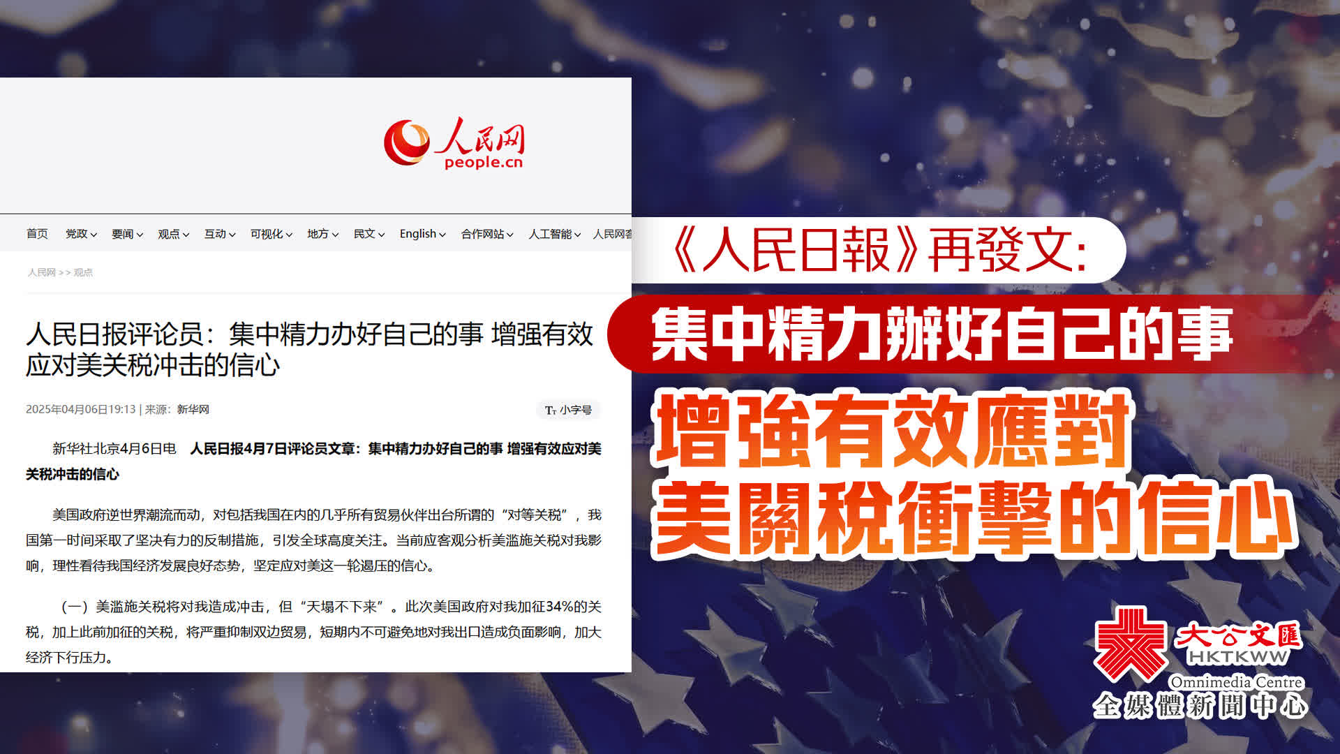 大公文匯全媒體報道,美國總統特朗普當地時間4月2日簽署兩項所謂對等關稅行政命令,掀起新一輪全球關稅大戰。據新華社報道,《人民日報》4月7日將刊發題為《集中精力辦好自己的事 增強有效應對美關稅衝擊的信心》的評論員文章,指出美國對中國商品加徵34%的關稅,加上此前加徵的關稅,將嚴重抑制雙邊貿易,短期內不可避免地對中國出口造成負面影響,加大經濟下行壓力,但中國是超大規模經濟體,面對美國的關稅霸凌衝擊,具有強大的抗壓能力,對美出口下降不會對整體經濟造成顛覆性影響。全文如下: