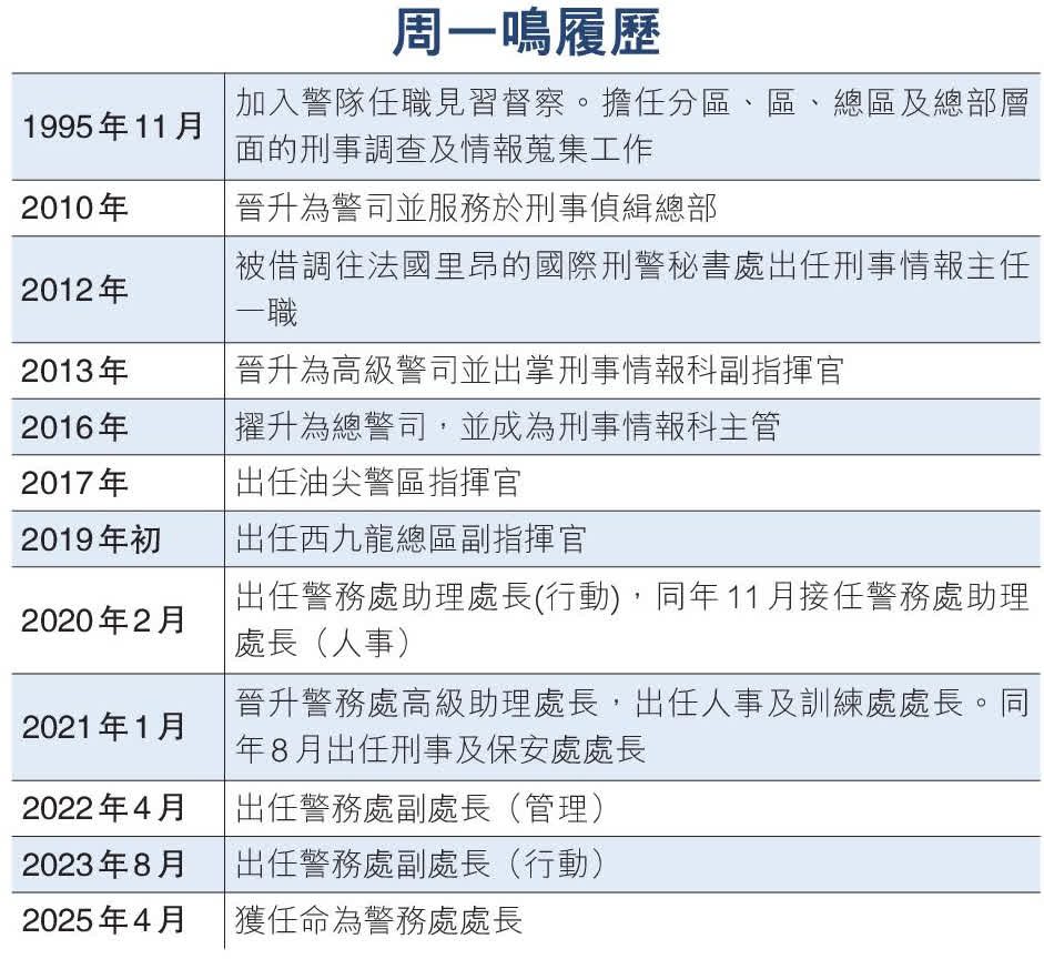 周一鳴畢業於香港中文大學生物化學系,1995年加入警隊任職督察,大部分時間擔任分區、警區、總區及刑事總部的刑事偵緝工作,他履新後首次接受香港文匯報等傳媒專訪,表現出硬朗果斷作風,被問到過往擔任的崗位中,哪個最喜歡?他目光銳利地說:「每一個崗位,即使我離開或調離後,都會為曾在這個崗位駐守過為榮。」