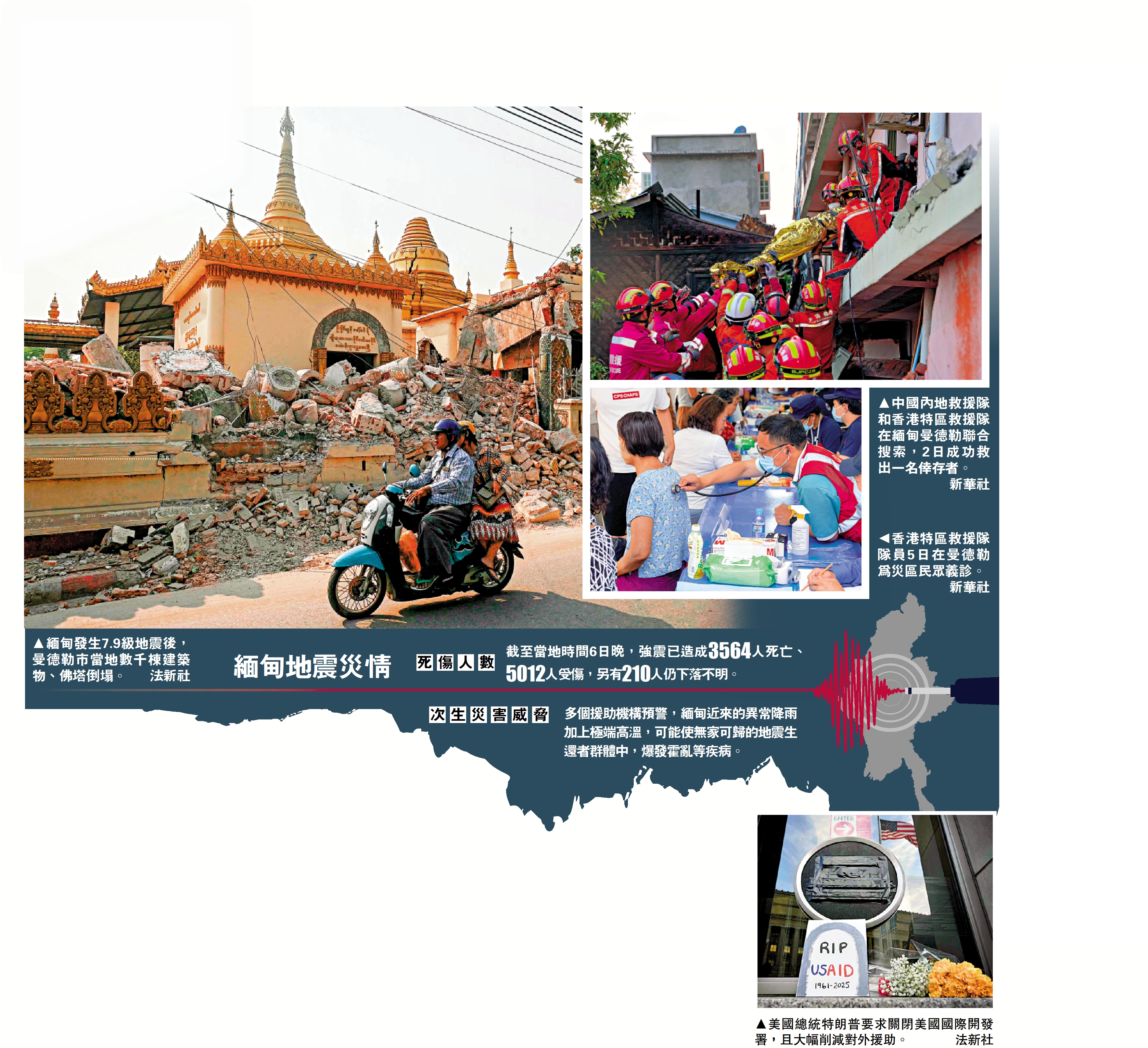 3月28日,緬甸發生7.9級地震。緬甸國家管理委員會6日發布消息說,截至當地時間6日晚,緬甸強震已造成3564人遇難、5012人受傷,另有210人被報失蹤。救援機構表示,部分災區正持續降雨,恐使救援工作難度提高、災民感染疾病風險攀升。