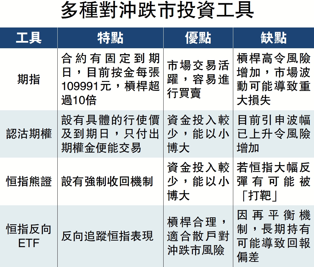 港股吹淡風,謝明光建議,投資者可善用衍生工具對沖跌市風險。每當跌市來臨,期指、恒指熊證、認沽期權或反向ETF都能對沖跌市風險。其中,期指目前按金每張109991元,槓桿超過10倍,由於不少淡友已在過去兩個交易日入市,很可能短期內平倉離場,令指數出現短期反彈,沽期指的風險因而較高。