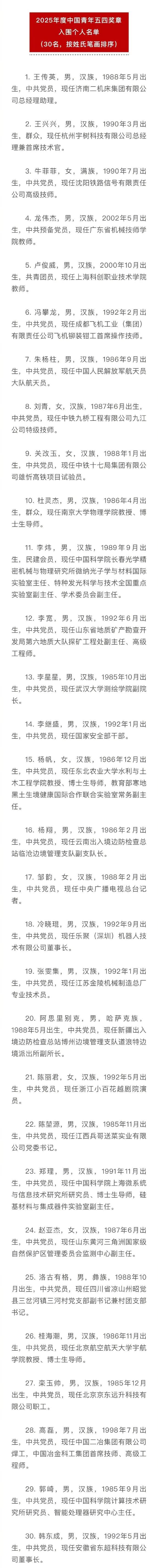 據共青團中央消息,2025年度中國青年五四獎章入圍名單公示。其中,宇樹科技創始人王興興、浙江小百花越劇院演員陳麗君、航天員朱楊柱和桂海潮、總台記者鄒韻、96712部隊44分隊、中航黎巴嫩撤僑包機機組等入圍。