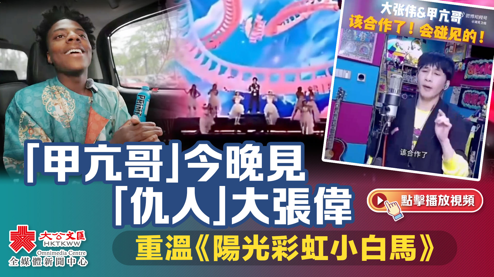 4月5日晚上,大張偉在直播中回應網友是否會與美國網紅「甲亢哥」合作,他表示:「該合作了,會碰見的,我們有一個安排。人家那麼可愛是不是,應該可以。」今日(7日)中午,湖南衛視發布微博證實,「甲亢哥」將和大張偉在湖南衛視新綜藝錄製現場見面。隨後,湖南衛視官微發布開啟「甲亢哥」和大張偉緣分的神曲《陽光彩虹小白馬》。