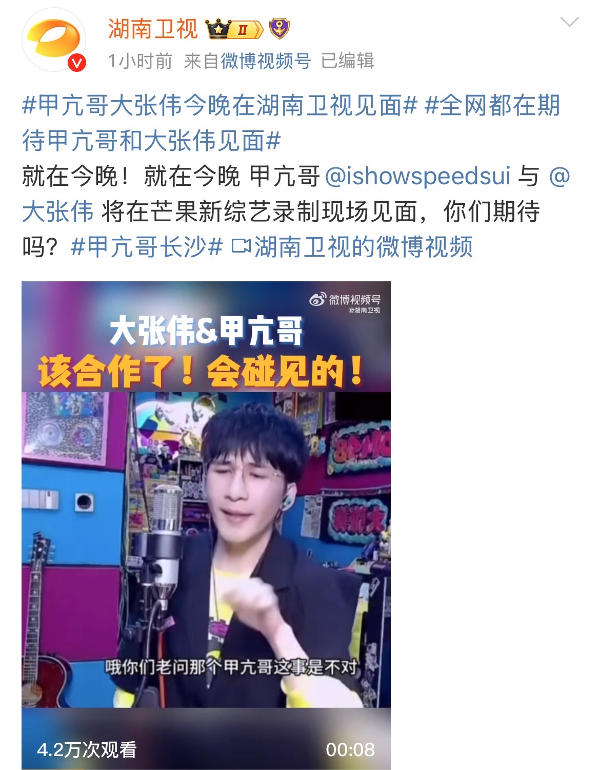 大公文匯全媒體報道,美國網紅「甲亢哥」(I Show Speed)今日(7日)來到中國行最新一站——湖南長沙,並將於下午3時開啟直播。據悉,今晚「甲亢哥」將和「仇人」大張偉,即《陽光彩虹小白馬》原唱,在湖南衛視新綜藝中見面。