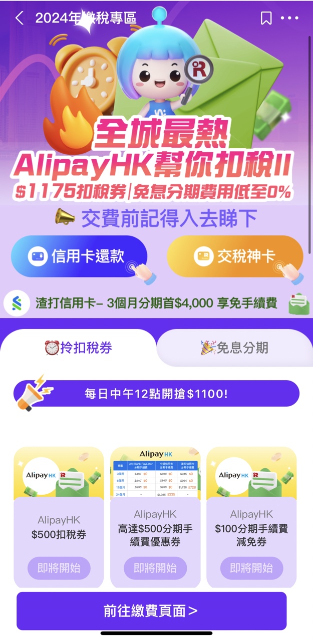 AlipayHK指,23/24年度一期稅務透過AlipayHK繳交稅款筆數按年激增90%,其中逾四成用戶選擇用信用卡或分期服務款項。即日起至4月30日,AlipayHK推出限時優惠,每日中午12時進入繳稅專區搶扣稅券,即有機會獲取最高港幣1,175元扣稅優惠。另外,參加Ant Bank退稅抽獎,參與指定任務如綁定Ant Bank繳稅滿5,000元或申請分期貸款,可享最多7次抽獎機會,頭獎可獲5,000元現金退稅或港幣5,000元旅遊禮券。