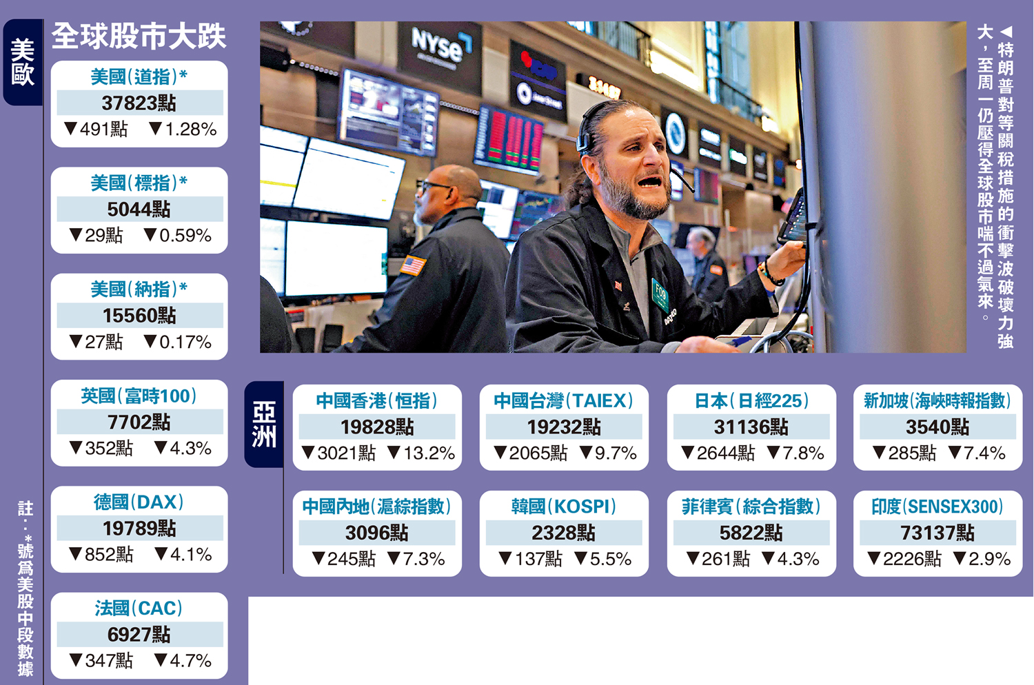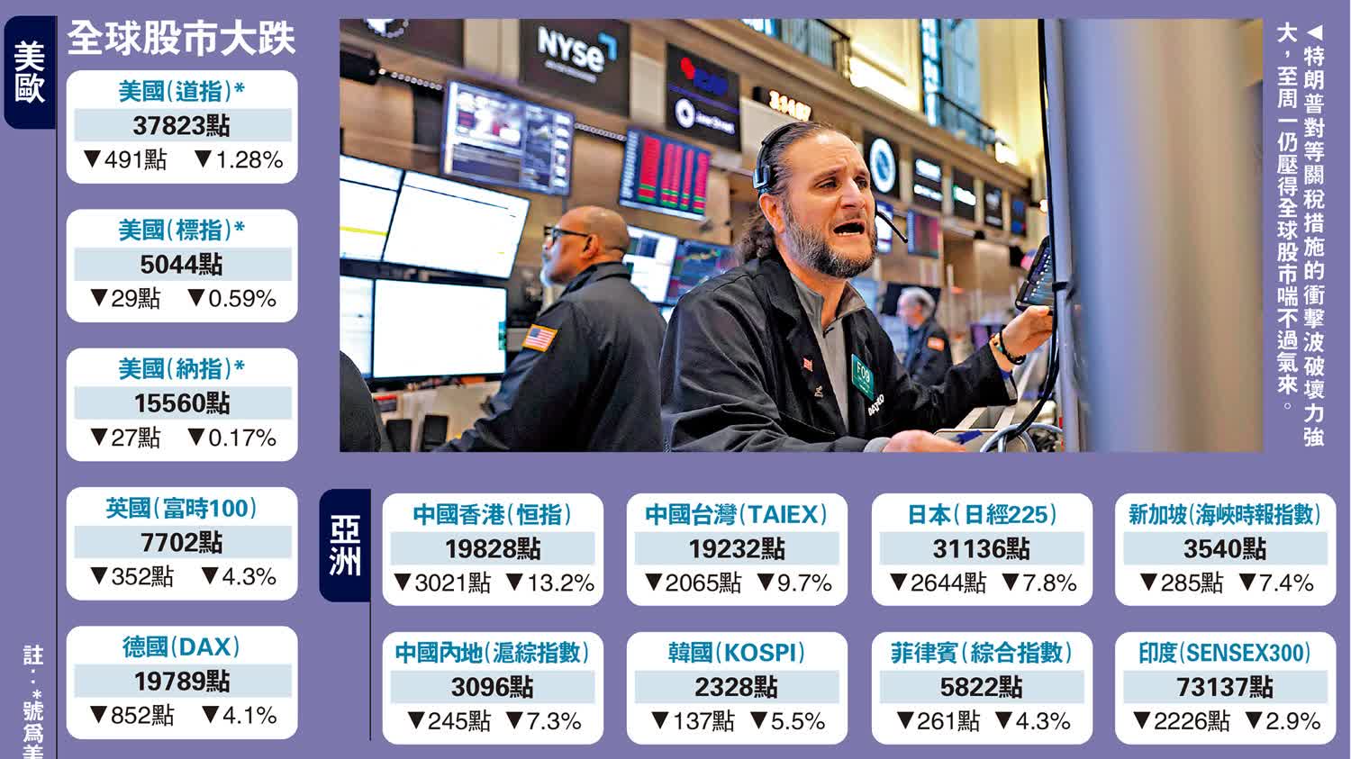 美股昨日開盤已即插水,市場一度傳出特朗普考慮推遲關稅90日後實施,美股一度轉升,唯其後白宮發出聲明否認,並指是假新聞。其後,特朗普在社交媒體平台發文,要求中國取消34%的報復性關稅,否則將對中國產品進一步開徵50%新關稅之外,並將取消所有與中國的談判計劃。貼文一出不但未有振興美國投資者,反而令市場恐慌情緒升溫,美股道指跌1.3%或491點,見37823點,標普500指數及納指再失0.6%及0.2%。彭博社報道,環球股市自美國宣布對等關稅措施至今,市值已蒸發9.5萬億美元。