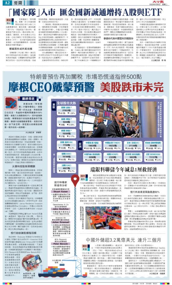 摩根大通行政總裁戴蒙周一在致股東信表示,美國和其他國家徵收的關稅將推高通脹,並增加經濟衰退的可能性。他又坦言,儘管最近市場出現暴跌,但股市可能還會進一步下跌,原因是美股現時估值仍然相對較高。