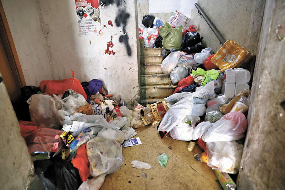 (香港文匯報記者 蕭景源、黃子龍)九龍深水埗一棟逾60年樓齡的「三無大廈」,過往依賴住戶集資聘請「垃圾姐姐」處理垃圾,惟最近因大部分業主拒絕再夾錢,導致梯間堆積大量廚餘、尿片等生活垃圾無人清理,散發惡臭,隨時可能衍生社區播菌危機。有業主昨日向香港文匯報表示,過往住戶一般會將垃圾扔到附近垃圾站,但近年接連有單位變為劏房,品流複雜,缺德住戶亂棄垃圾,清潔工憤然辭職,梯間垃圾堆積如山。香港文匯報介入後,關愛隊及當區區議員伸出援手協助清理垃圾,但他們表示清理只能解燃眉之急,需要透過成立法團及修例等手段治本。