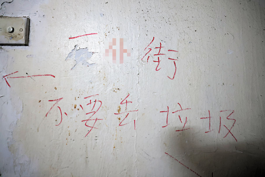記者現場可見,梯間通道至少一半位置被垃圾佔據,當中包括廚餘、空水瓶、發泡膠箱、舊衣物等。部分垃圾袋疑被尖銳物品刺破,或者未有綁好,袋內大量垃圾散落一地。有業主或住戶寫上告示,當中包括「不要丟垃圾」、「傢俬雜物,請物主拿出街外處理謝謝」。然而似乎並無作用。