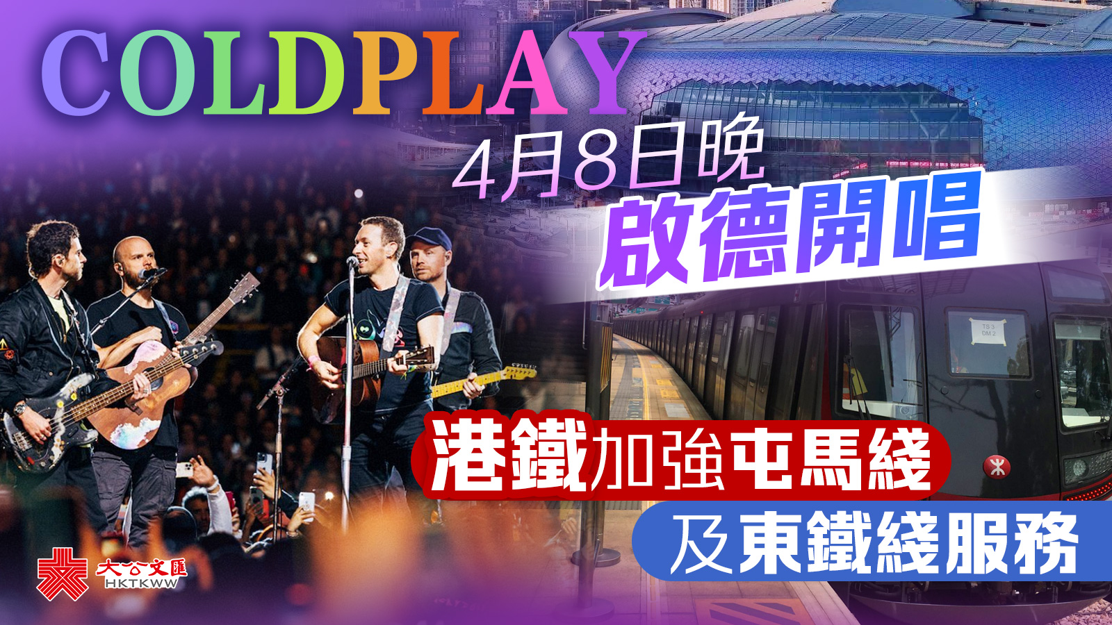 大公文匯全媒體報道,英國樂隊Coldplay今晚(8日)起在啟德主場館舉行4場演唱會,港鐵將加強屯馬綫及東鐵綫的列車服務。