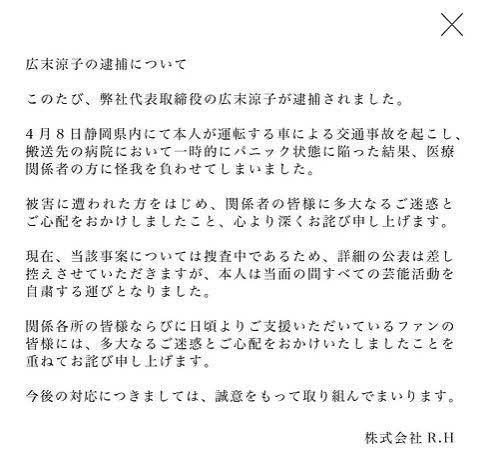 廣末涼子所屬事務所官網發布聲明,確認了廣末涼子被捕這一事實:「4月8日在靜岡縣內發生了由本人駕駛的汽車引起的交通事故,在被送往醫院的醫院中一時陷入恐慌狀態,結果導致醫療相關人員受傷。給受害的各位以及相關人員帶來了很大的麻煩,我從心底表示歉意。目前該案件正在調查中,暫不公布詳細情況,但目前將停止一切演藝活動。」