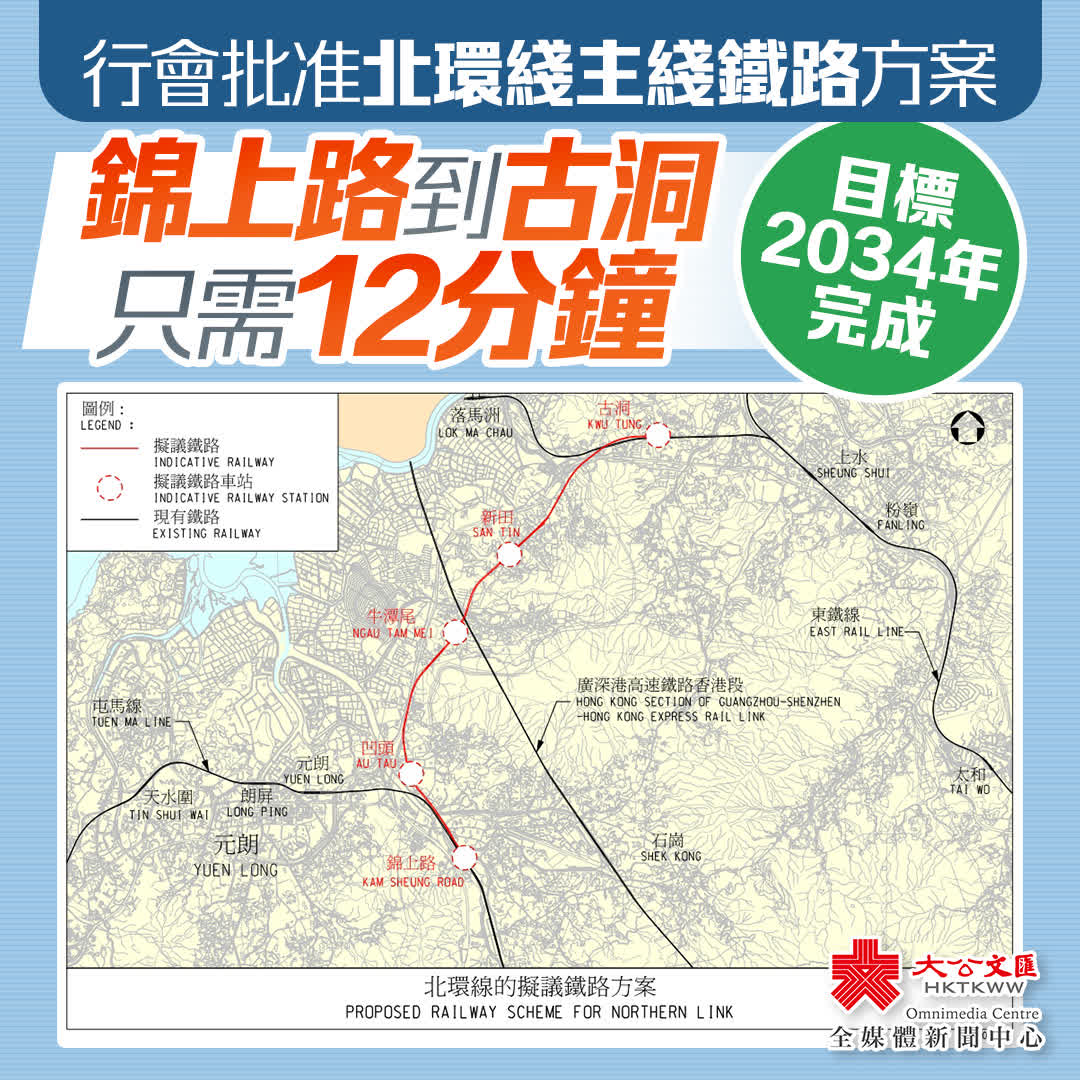 港鐵指,隨着鐵路方案獲得通過,公司會及早與政府落實項目協議,並繼續與不同持份者溝通協商,推進項目施工。港鐵已隨早前已啟動的東鐵綫古洞站項目有序地開展北環綫主綫的前期工程,爭取加快項目的推展,以達至於2034年竣工的目標。