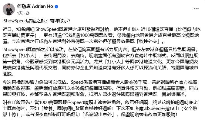 立法會議員何敬康4月7日在社交平台貼文指,「甲亢哥」的香港之旅引發熱烈討論,對方不但做了近10個小時的直播,較在內地的直播時間更長,全球更有超過1,000萬觀眾收看,是整個內地和香港之旅直播最高收視的地區。何敬康認為,這次「甲亢哥」的香港之行,成為本港對外宣傳的一次意外但是極具效果的「軟性外交」。