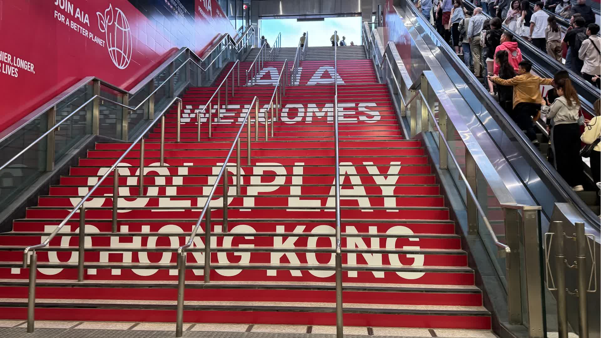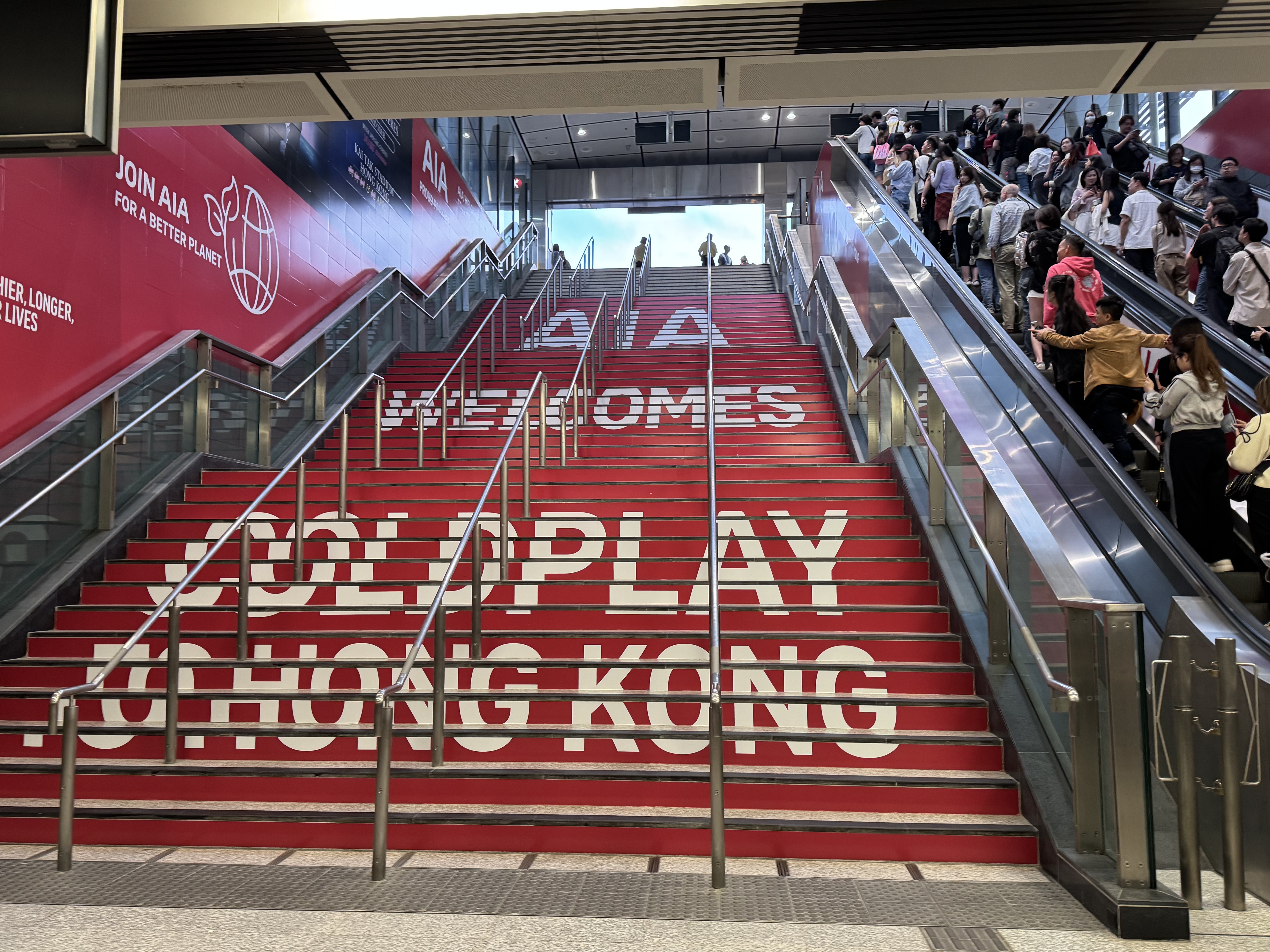 我大約晚六點半到達港鐵啟德站,看到階梯上貼了很多Coldplay的宣傳,扶手電梯滿是來看演唱會的歌迷。出地鐵站看到巨幅宣傳海報,感覺是很好的打卡點,周圍很多人在拍照,已經感受到了演唱會的熱烈氣氛。