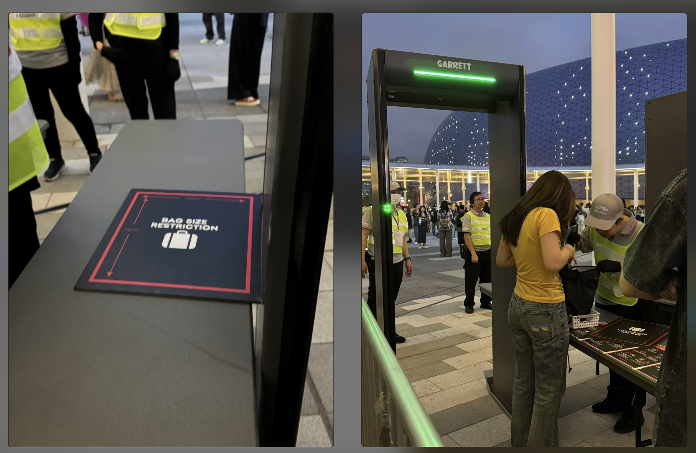 大概步行十幾分鐘後,18時55分我到達安檢口,現場開放了非常多的安檢通道,閘口很多,井然有序,一點也不擁擠。排隊大概20分鐘後,到我安檢,可能因為我背了一個非常小的包,因此沒有被要求開包檢查,全程2分鐘絲滑過關。我之前做了很多攻略,知道安檢嚴格,拍攝器材、水杯等都有限制,所以為了快速過關我東西帶的不多。排在我前面的人是大單肩包,就被要求開包檢查,時間就會久一些。現場有一個測量包大小的墊子,如果超出大小,就不能帶入場館。