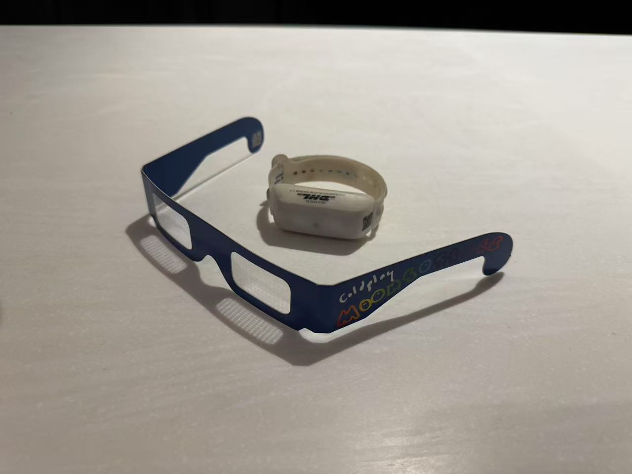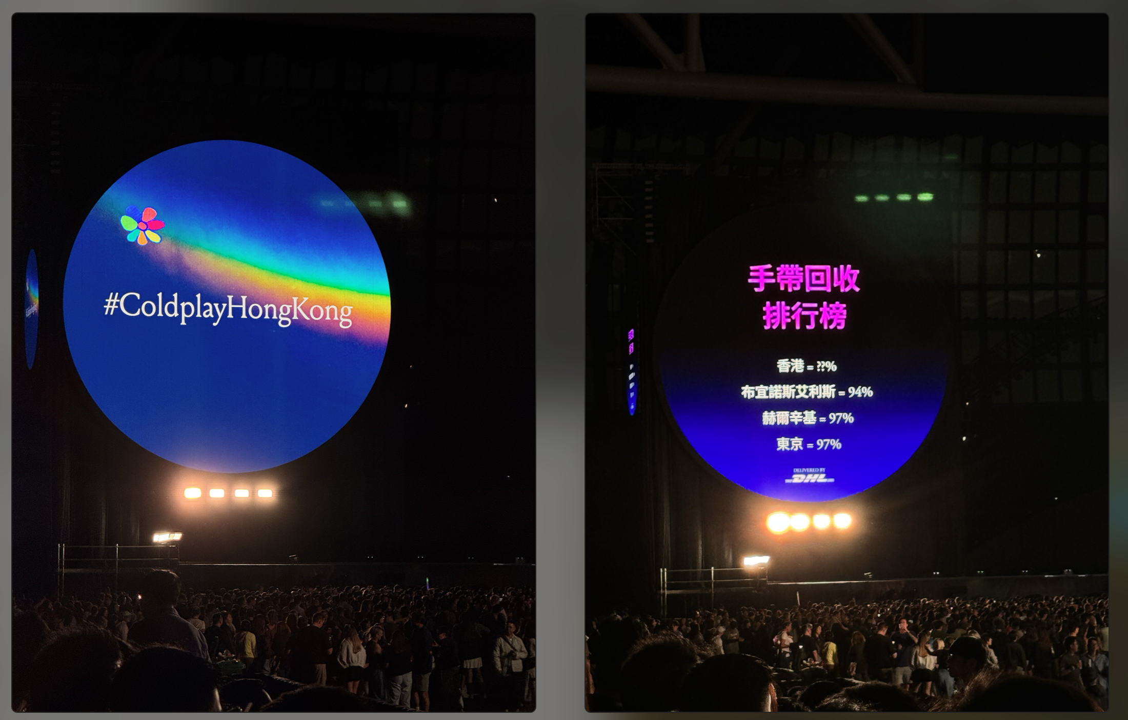 過了第一道查包安檢後,找到自己門票所在區域的入口,進去是第二道驗票,刷票上的二維碼進去,然後領取應援手環和愛心眼鏡,負責核驗分發的工作人員也很多,很有秩序。其中,手環在演出結束後是要歸還的,回收再用,Coldplay會公布在每一個城市的手環回收率,感覺挺環保的。