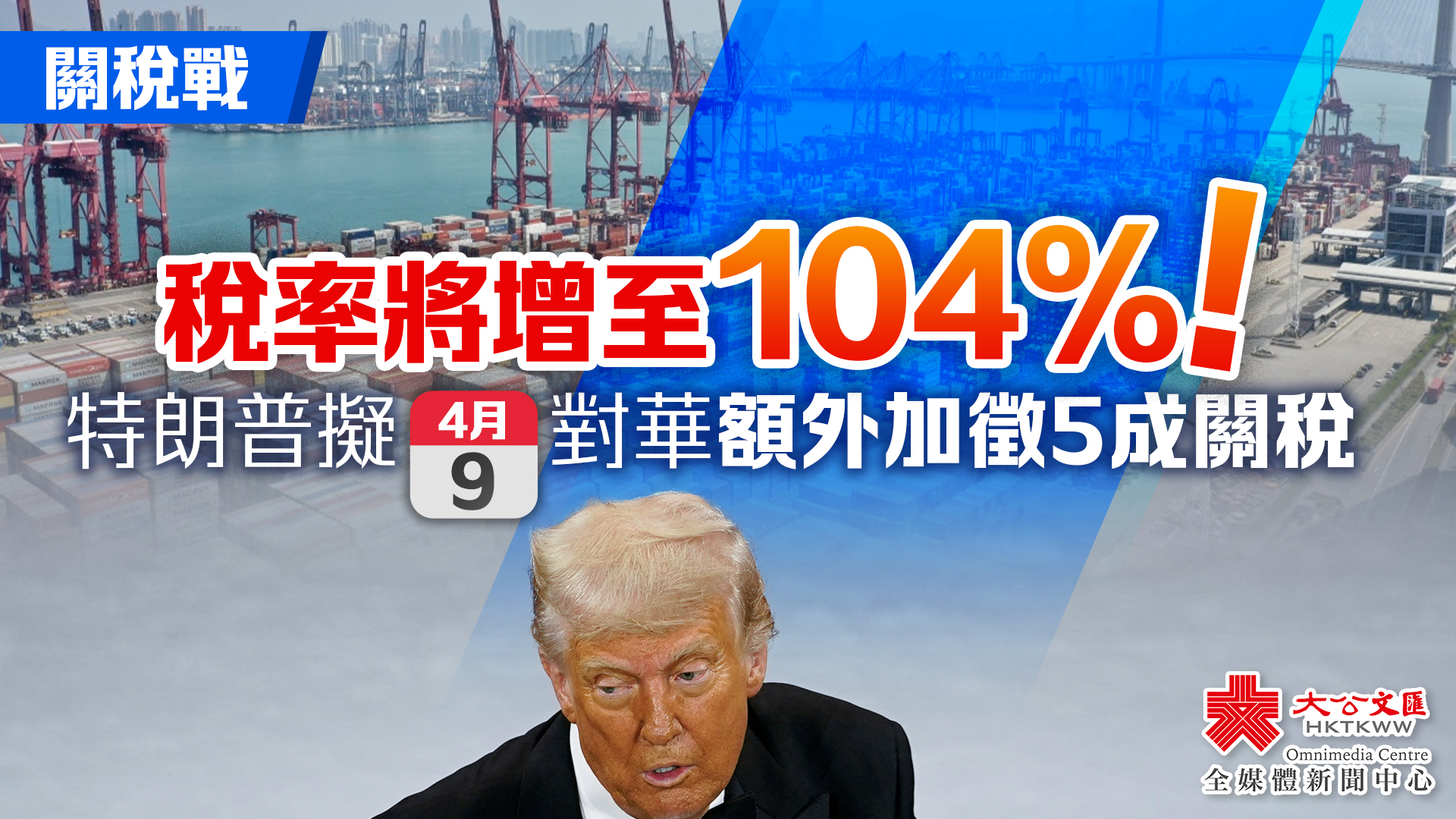 大公文匯全媒體報道,據傳媒9日引述消息稱,美國白宮證實,美國會對中國部分進口貨品徵收104%關稅。白宮發言人萊維特表示,由於中方拒絕撤回對美國的反制關稅,美國將於東部時間星期三(9日)凌晨零時一分起,開始對華徵收進一步關稅。