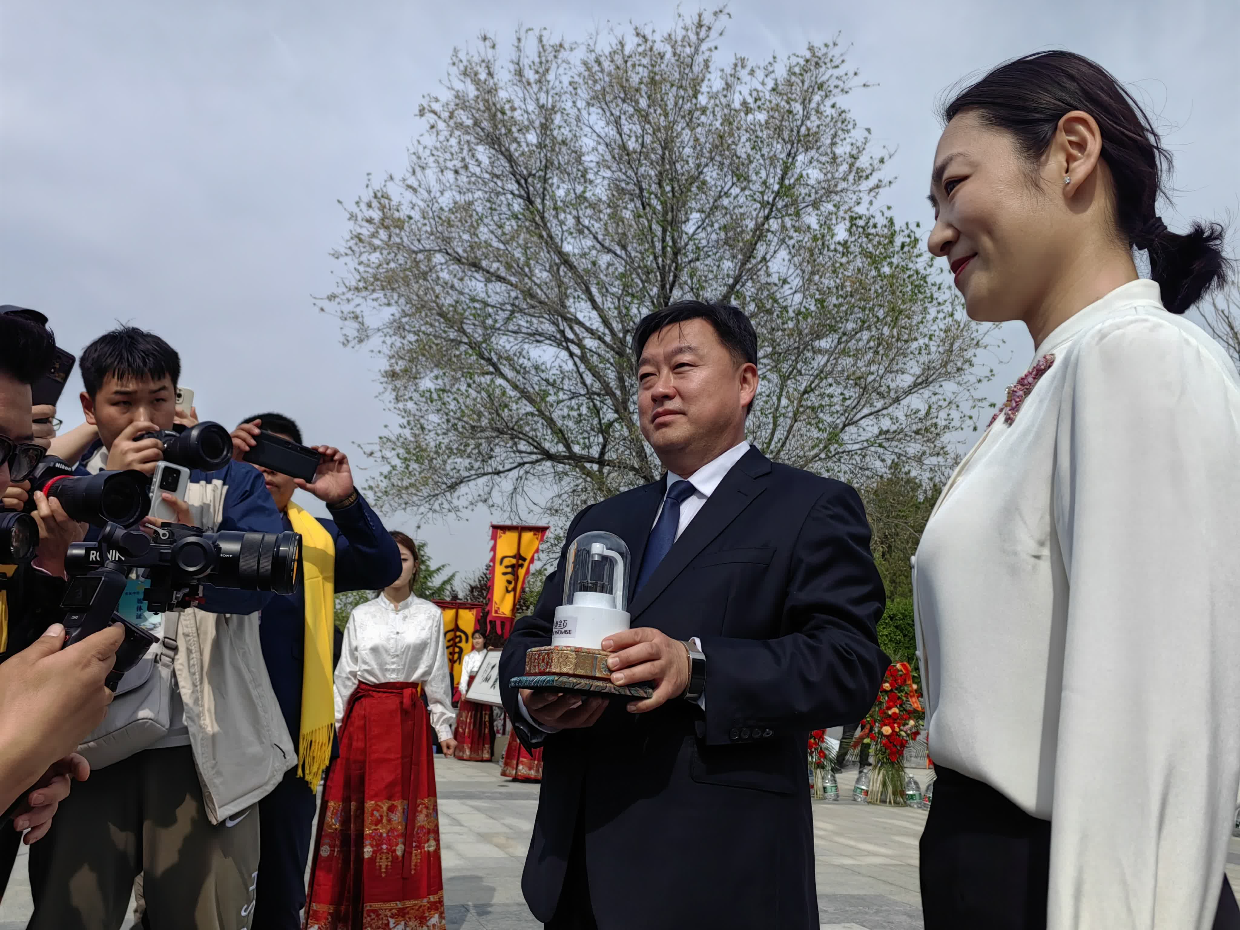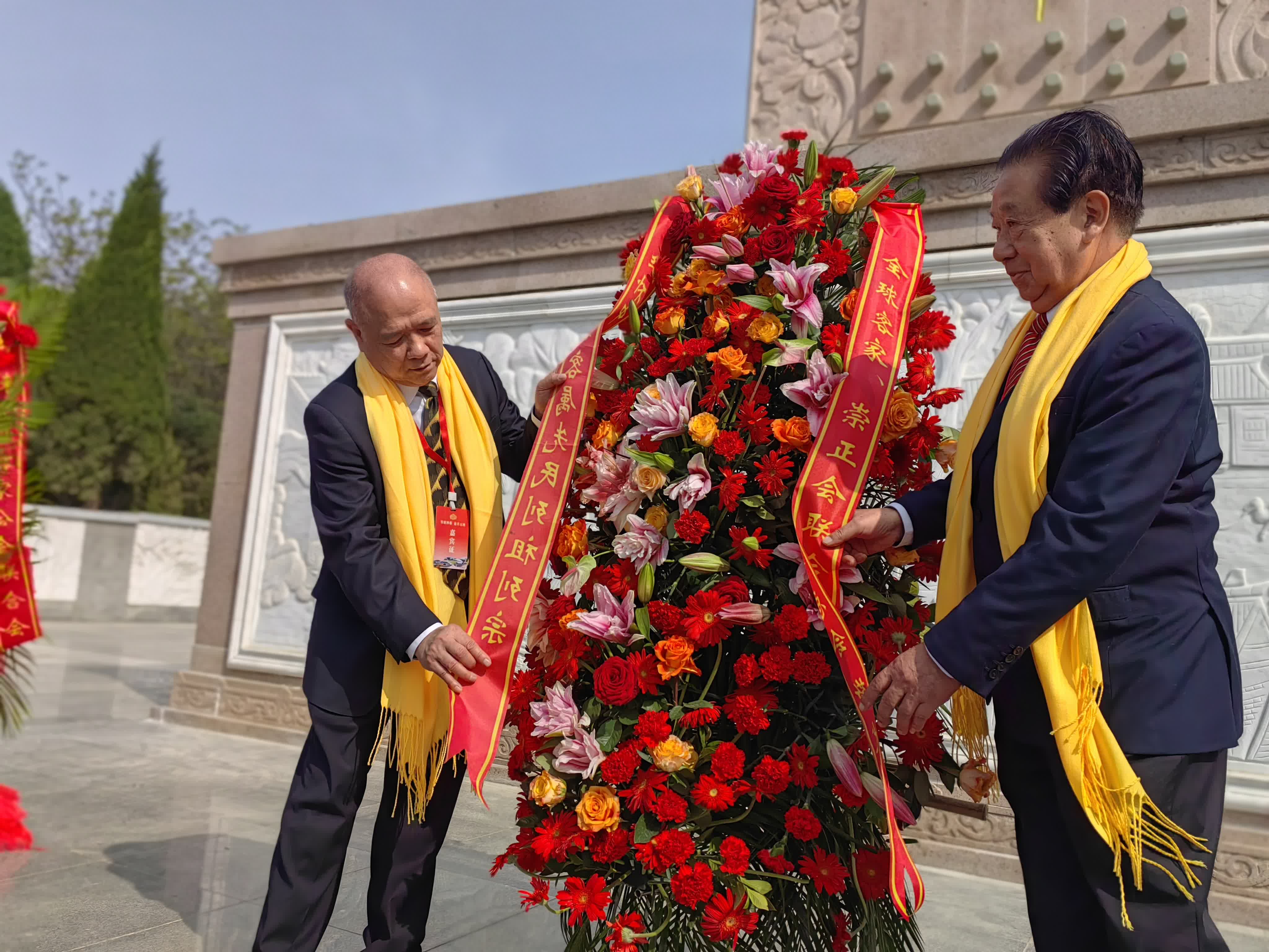 在莊重肅穆的音樂聲中,曾觀濤與崇正總會監事長黃莉民向中原客家先民南遷聖地紀念碑敬獻花籃。隨後,來自全球各地的客家代表緩步向前,敬獻花籃,整理緞帶,並行三鞠躬禮。洛陽客聯會會長王群樂向嘉賓贈送故土。