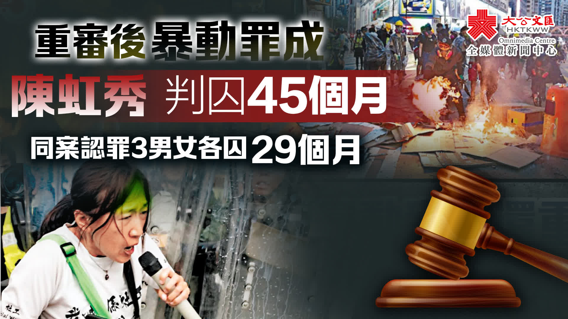(大公文匯全媒體記者 周傾芫)社工陳虹秀被控參與2019年8月31日灣仔暴動受審,區域法院暫委法官鍾明新早前裁定其暴動罪成。同案另3人則認罪,4名被告今日(9日)於區域法院判刑,陳被判囚3年9個月,同案認罪3人則各囚2年5個月。