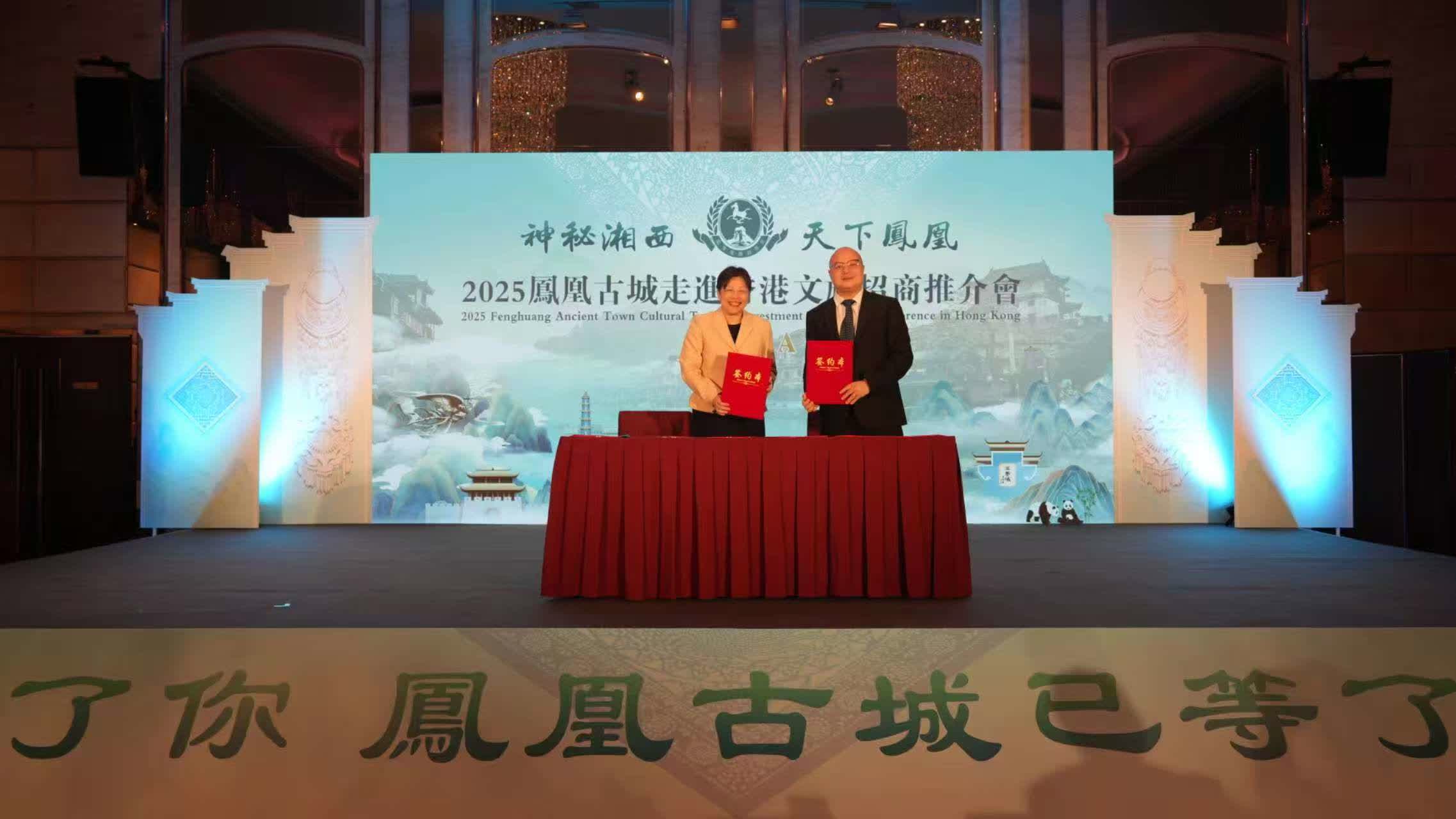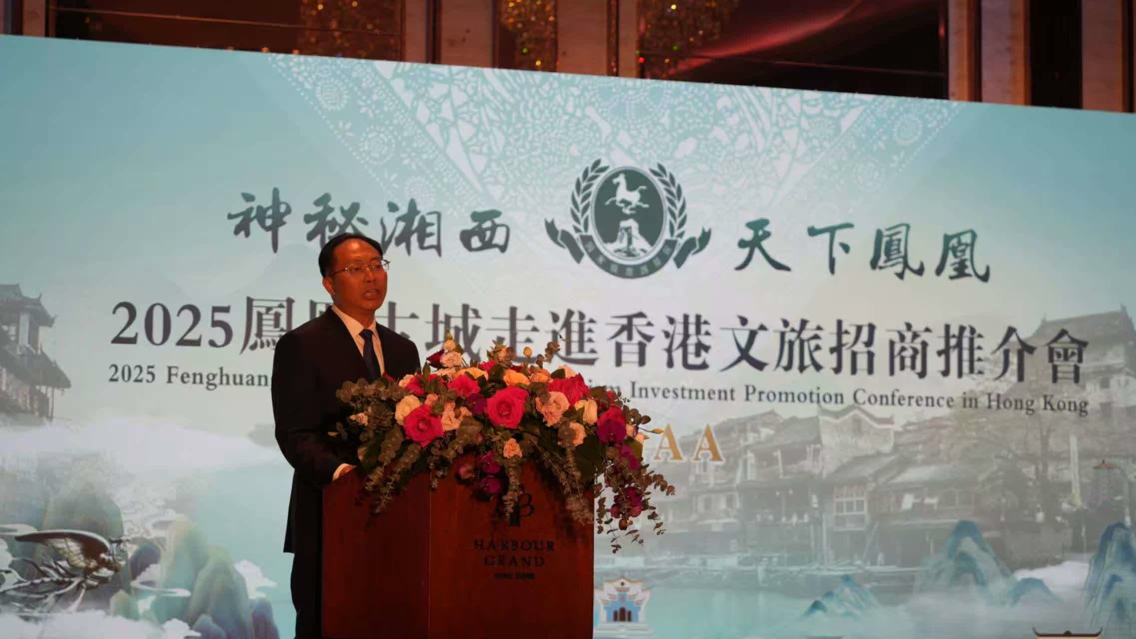 鳳凰縣委書記毛家致辭表示,香港是世界金融中心,也是魅力無限的「東方之珠」,鳳凰與香港雖相隔千里,但淵源深厚、人文相通。2024年6月,一條聯通鳳凰至香港的高鐵正式開通,不僅為文旅出行帶來諸多便利,也將兩地的山高水長、路途遙遠轉變為山水相依、天涯咫尺。