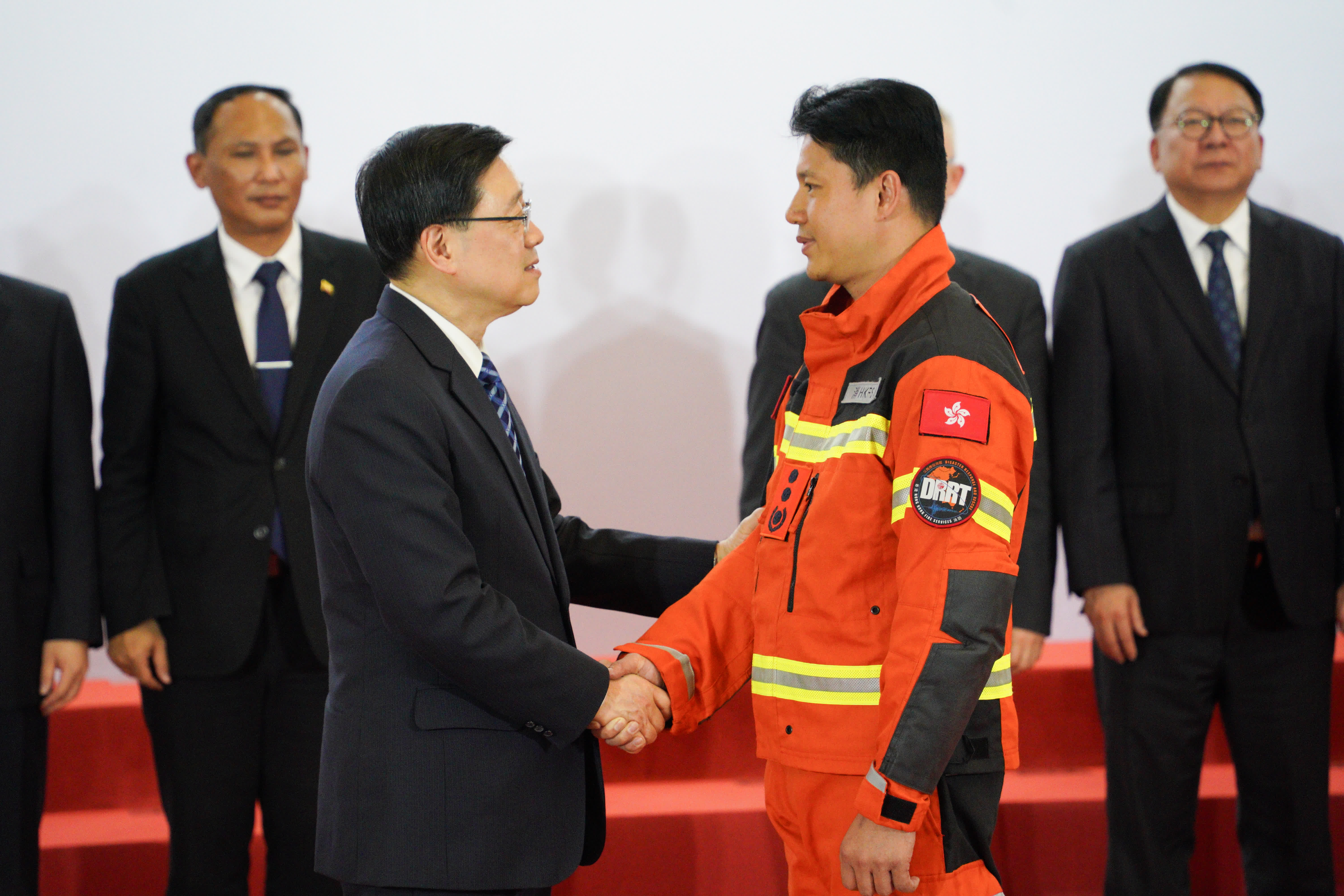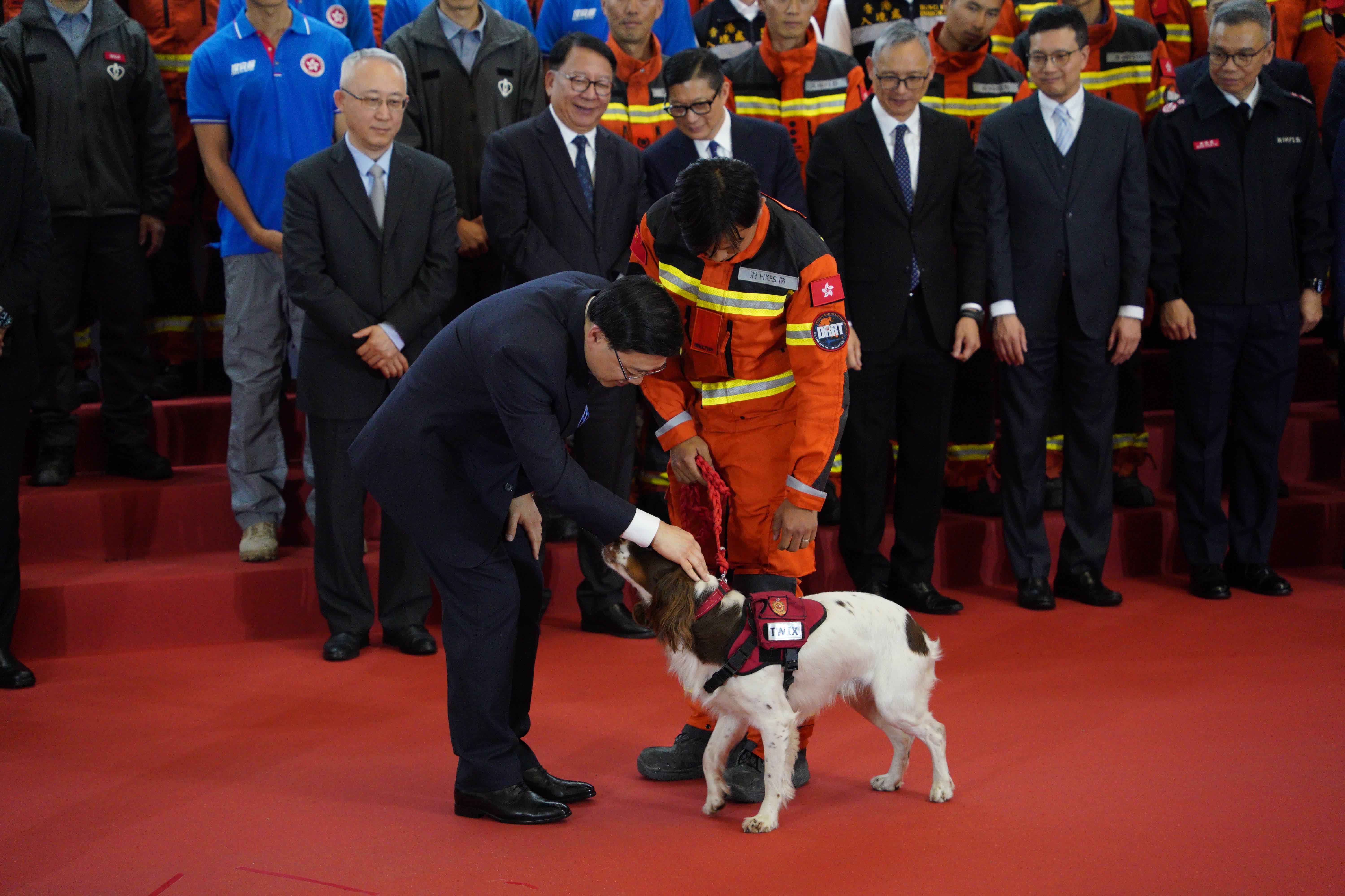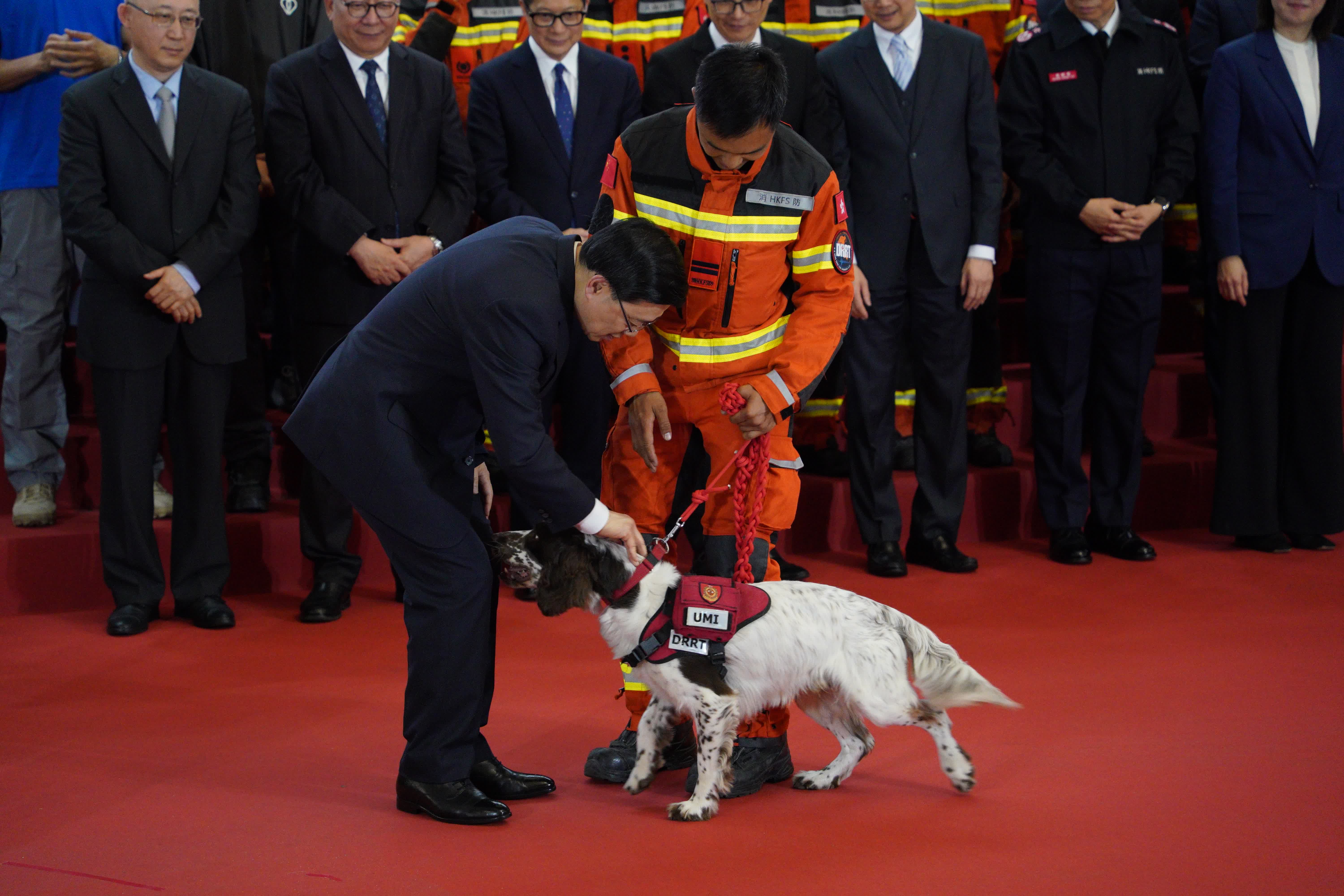 李家超親切慰問了守候在接機大廳的救援隊員家屬致以親切慰問,並與全體隊員逐一握手交流。儀式現場特別引人注目的是,李家超還俯身輕撫參與任務的搜救犬,向這位特殊的「救援隊員」表達讚賞。
