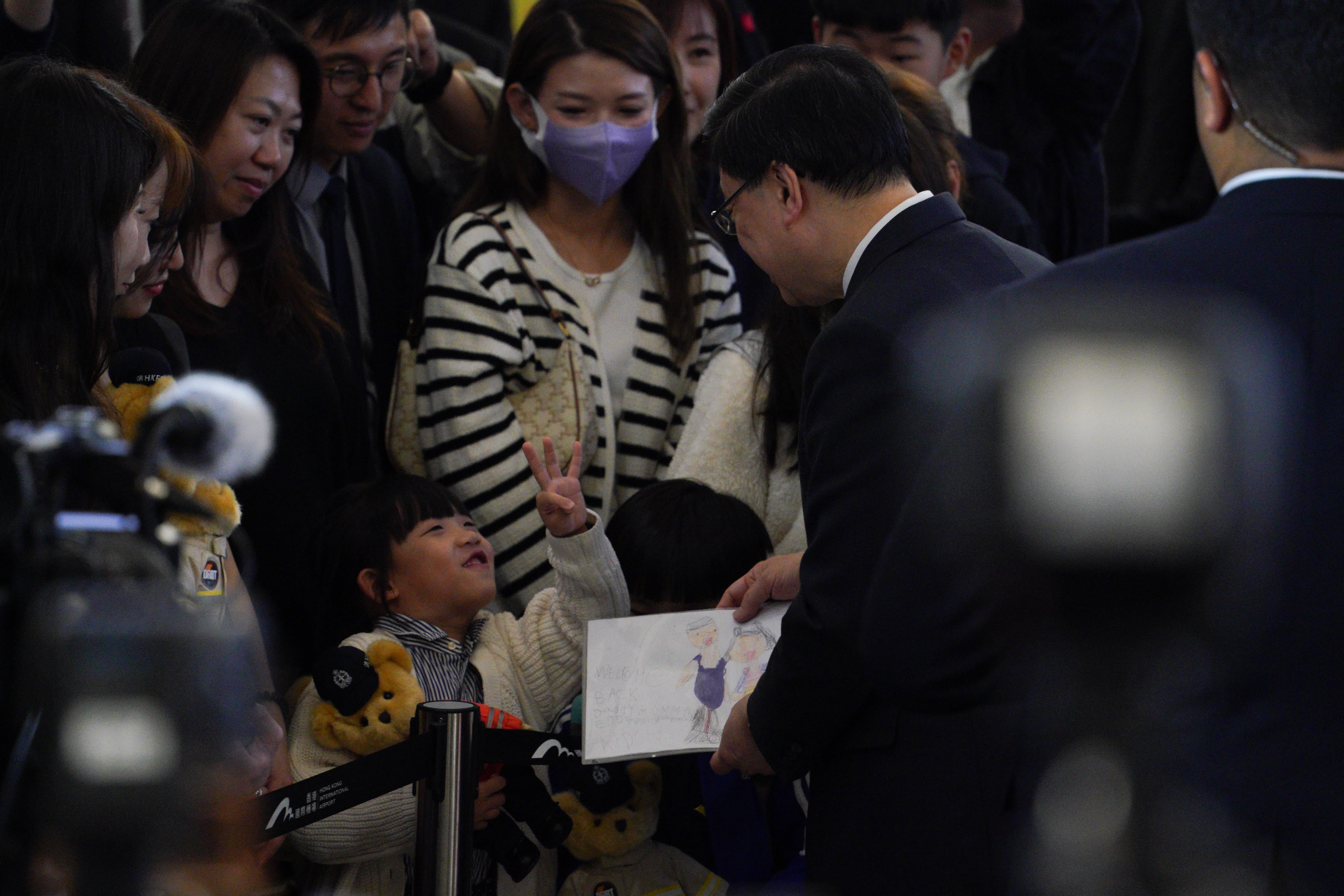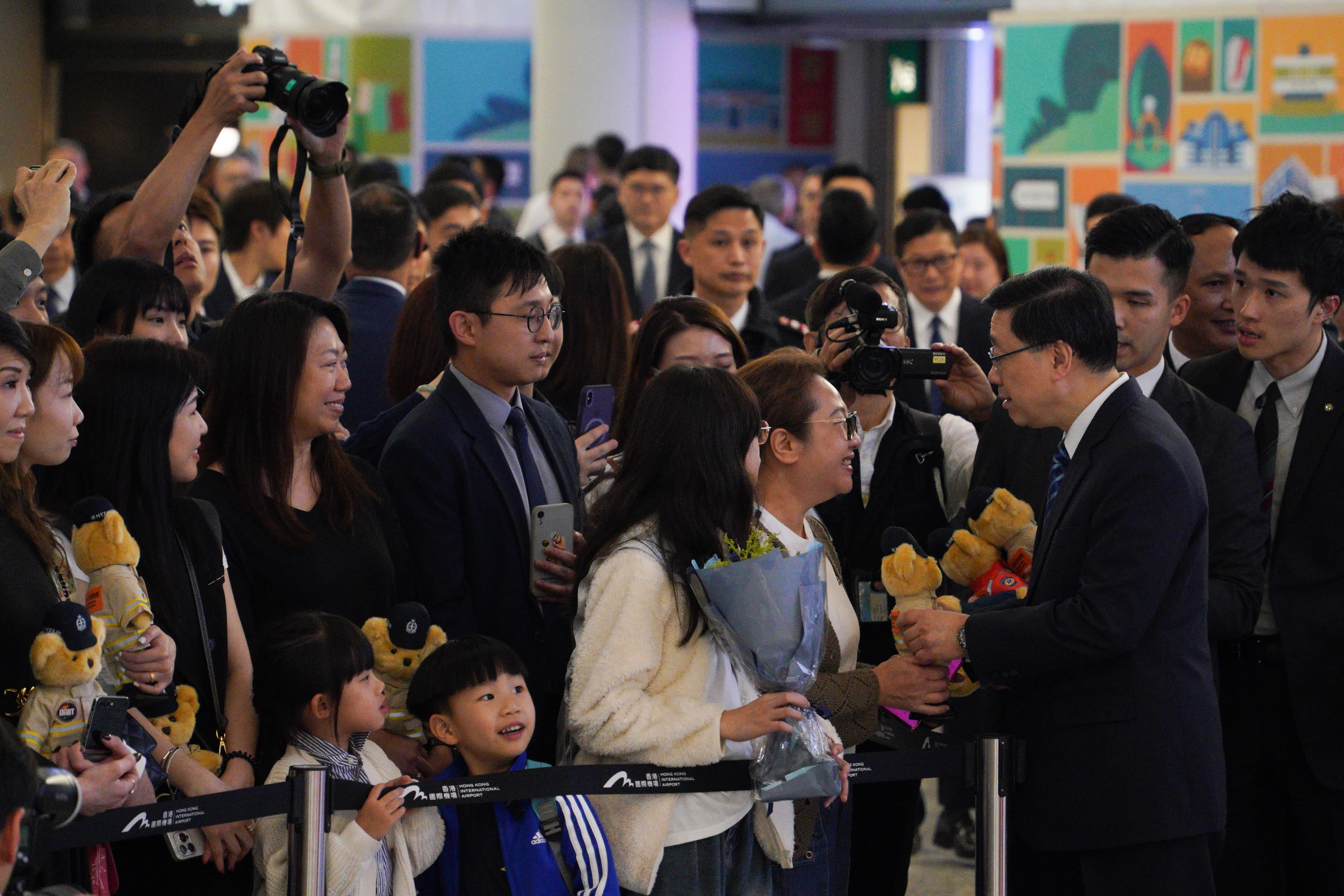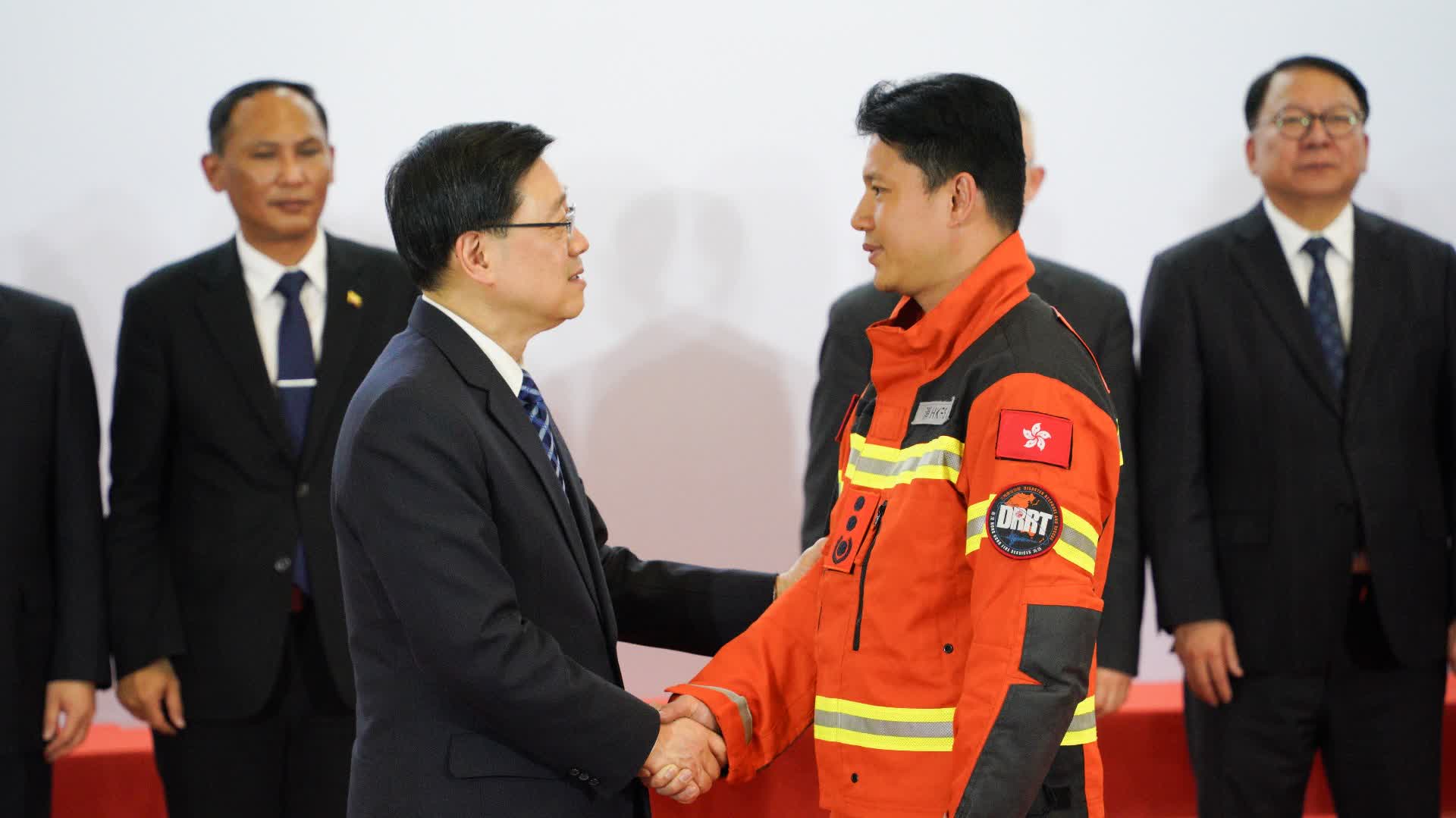 李家超親切慰問了守候在接機大廳的救援隊員家屬致以親切慰問,並與全體隊員逐一握手交流。儀式現場特別引人注目的是,李家超還俯身輕撫參與任務的搜救犬,向這位特殊的「救援隊員」表達讚賞。