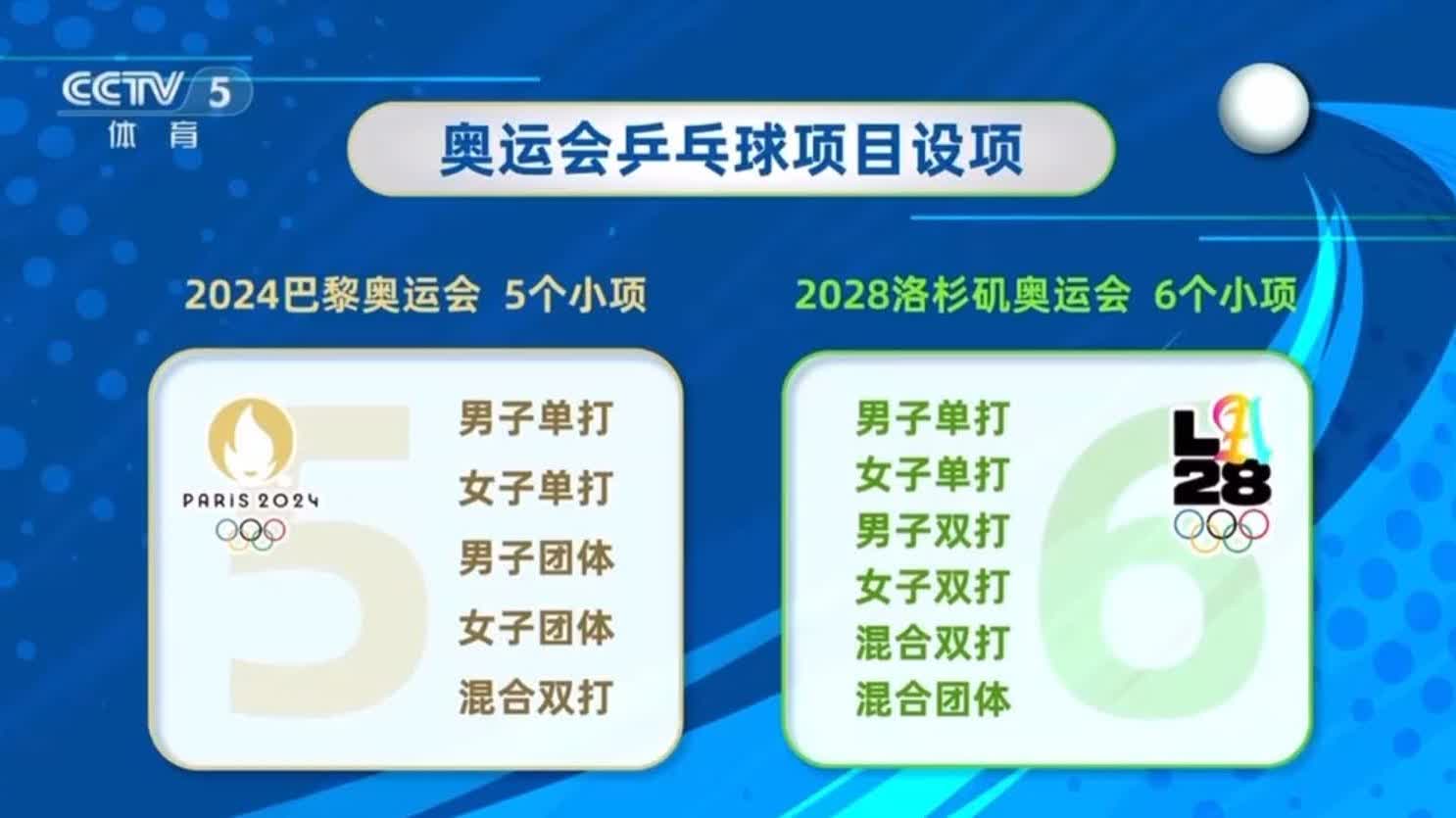 - 2028年洛杉磯奧運會乒乓球項目將設有六個比賽項目,除新設混合團體賽,2028年洛杉磯奧運會將恢復男子雙打和女子雙打項目,上一屆奧運會雙打冠軍是2004年雅典奧運會上奪冠的中國選手陳玘和馬琳(男子雙打),以及王楠和張怡寧(女子雙打)。