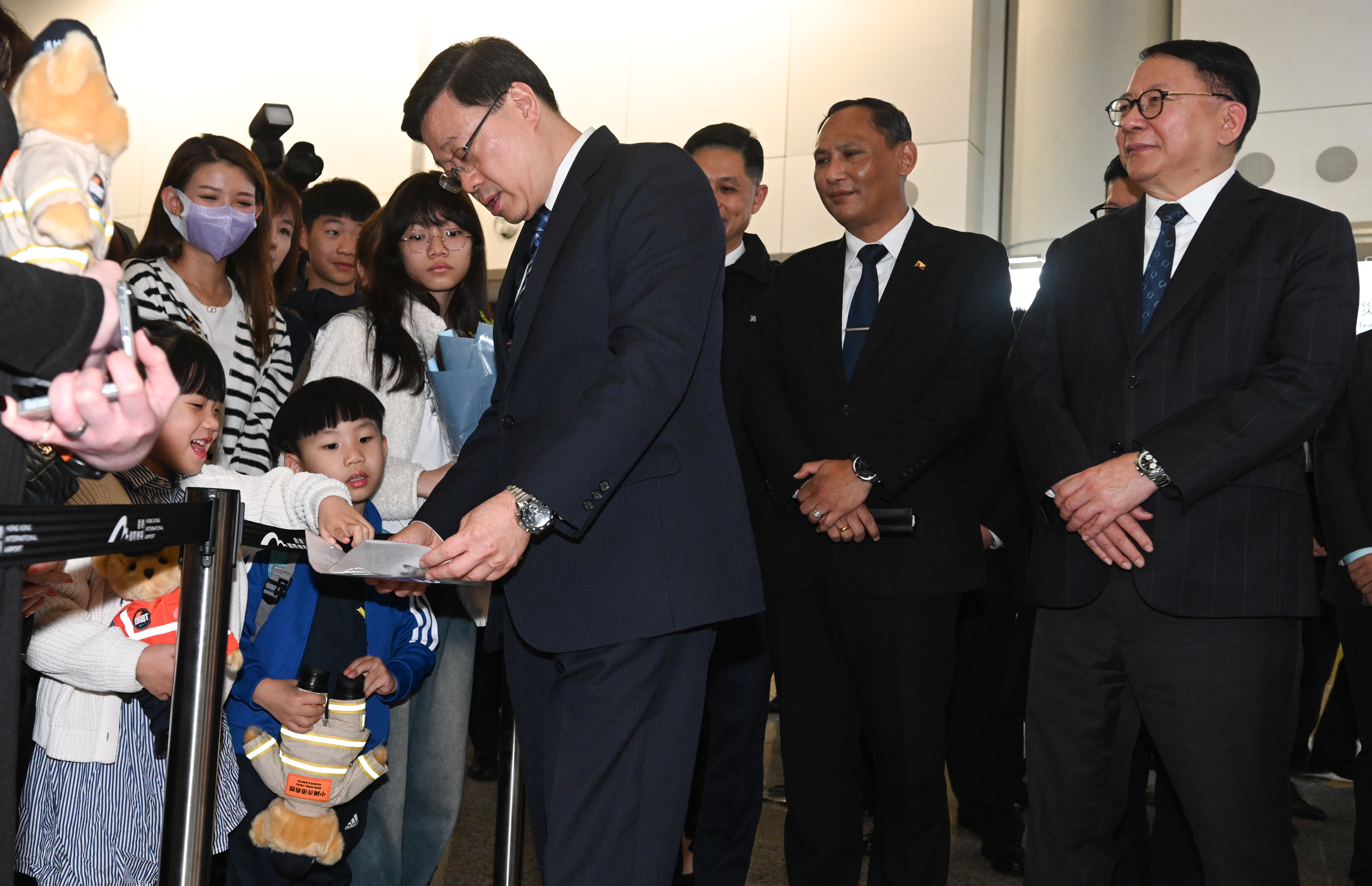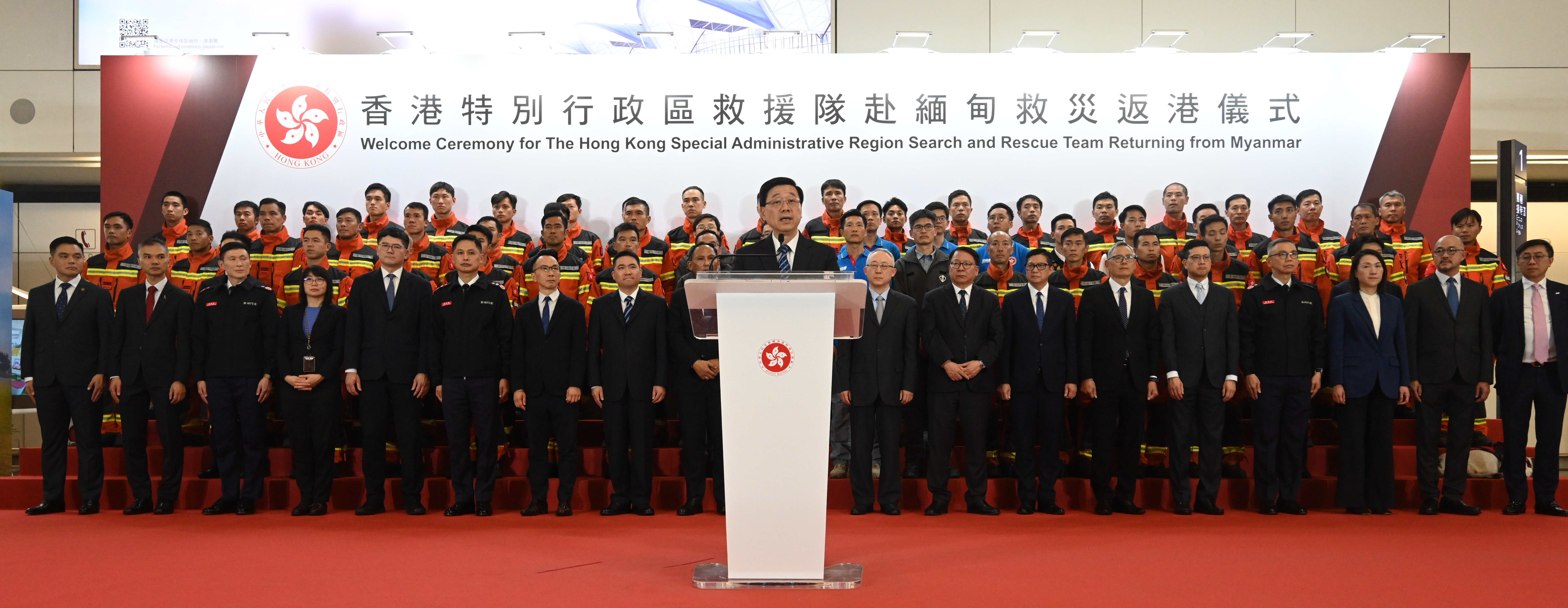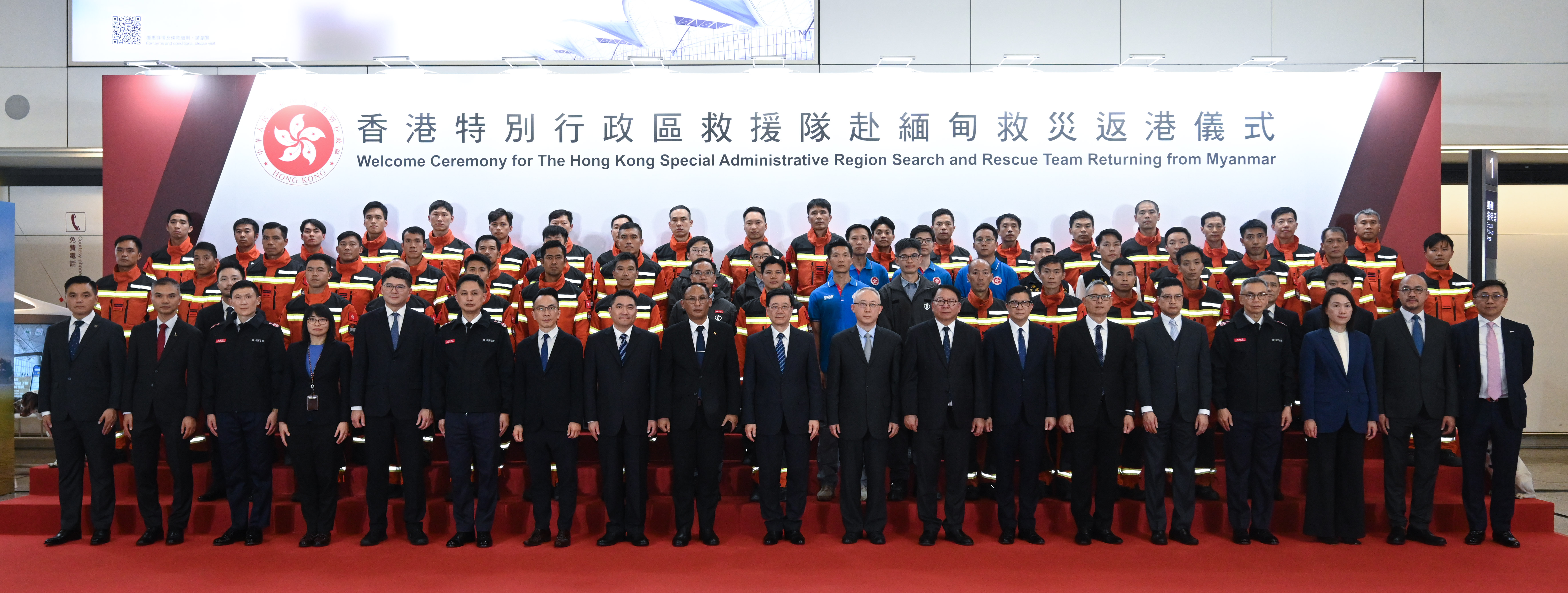 行政長官李家超、保安局常任秘書長李百全、保安局副局長卓孝業、署理入境事務處(入境處)處長程和木及醫院管理局(醫管局)行政總裁高拔陞醫生於香港國際機場迎接特區救援隊返港。