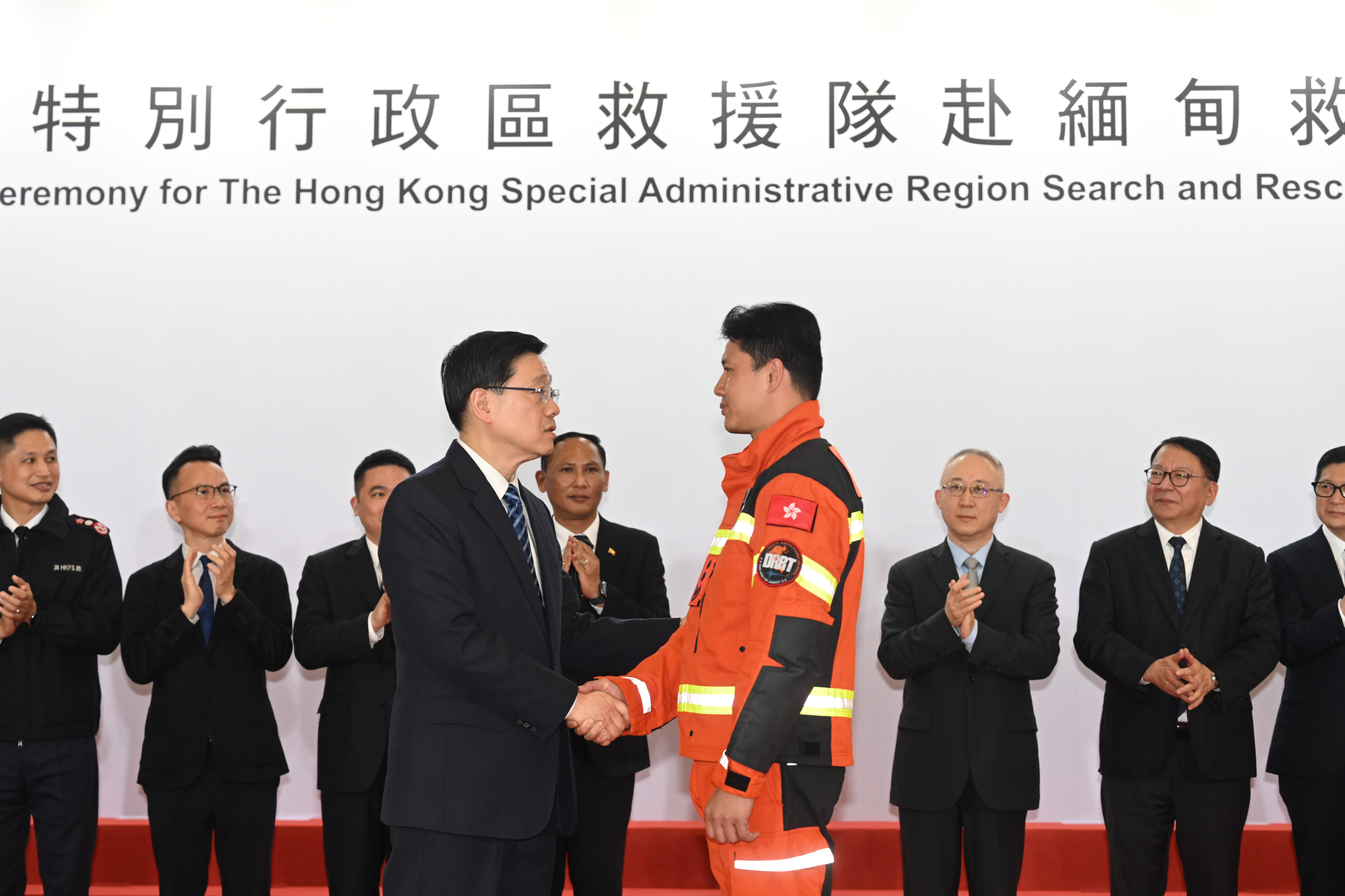 李家超致辭時表示,救援隊隊員憑藉專業的訓練、堅定的意志和無畏的勇氣,克服重重難關,與時間競賽,充分展現無懼挑戰、救急扶危的專業精神。