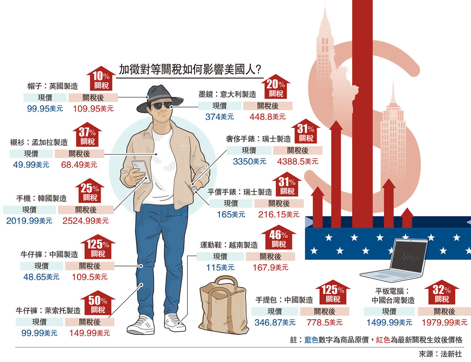 美國消費者日常所需要的很多生活用品都依賴外國進口和製造,包括水果蔬菜、電子產品、衣物或汽車零部件等。總部位於加州洛杉磯的投資銀行Wedbush分析師艾夫斯表示,美國總統特朗普對中國徵收的關稅,「將為美國消費者帶來五級颶風的價格風暴。」他以蘋果公司為例指出,特朗普引發的「關稅經濟末日」對蘋果來說是一場「徹底的災難」。