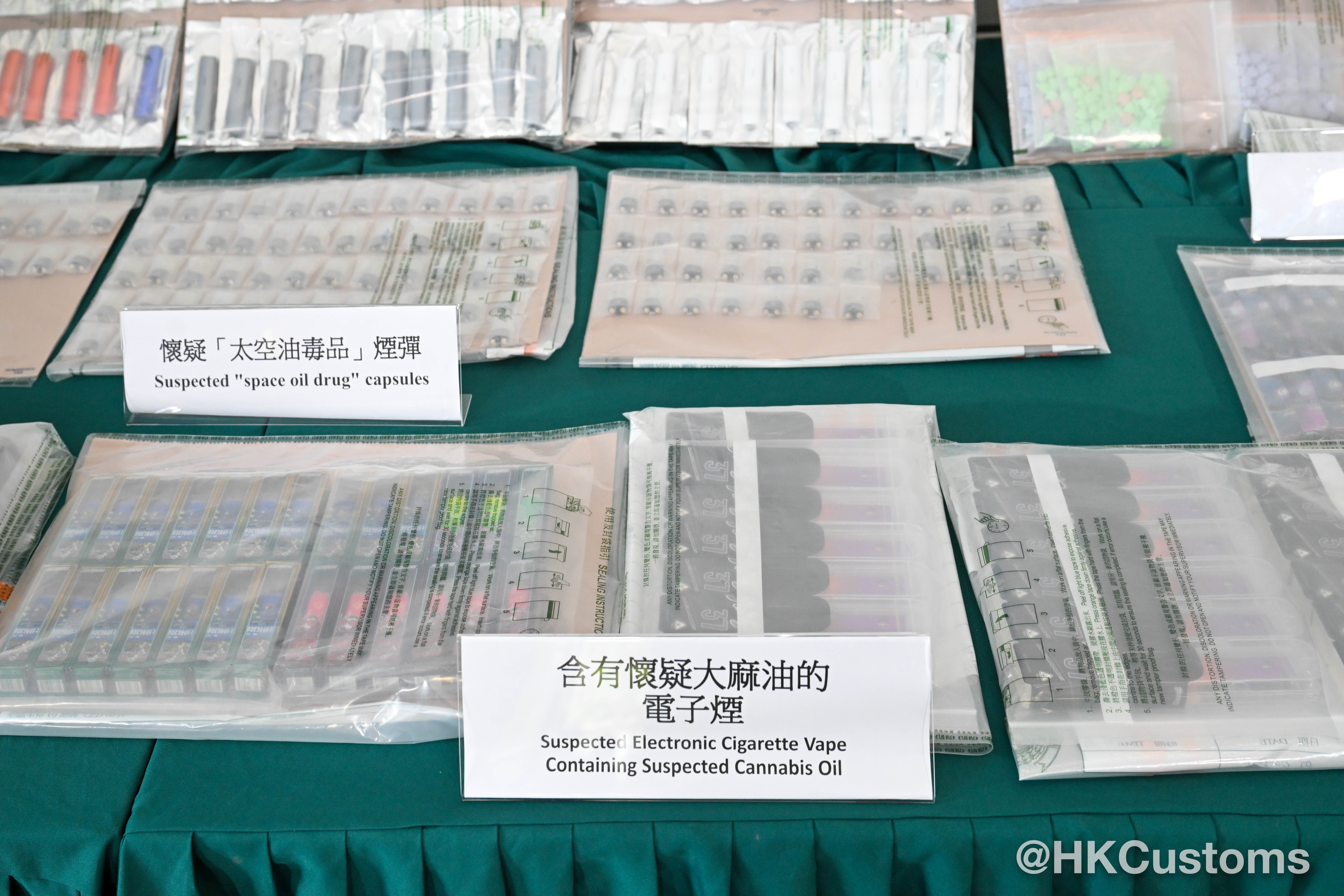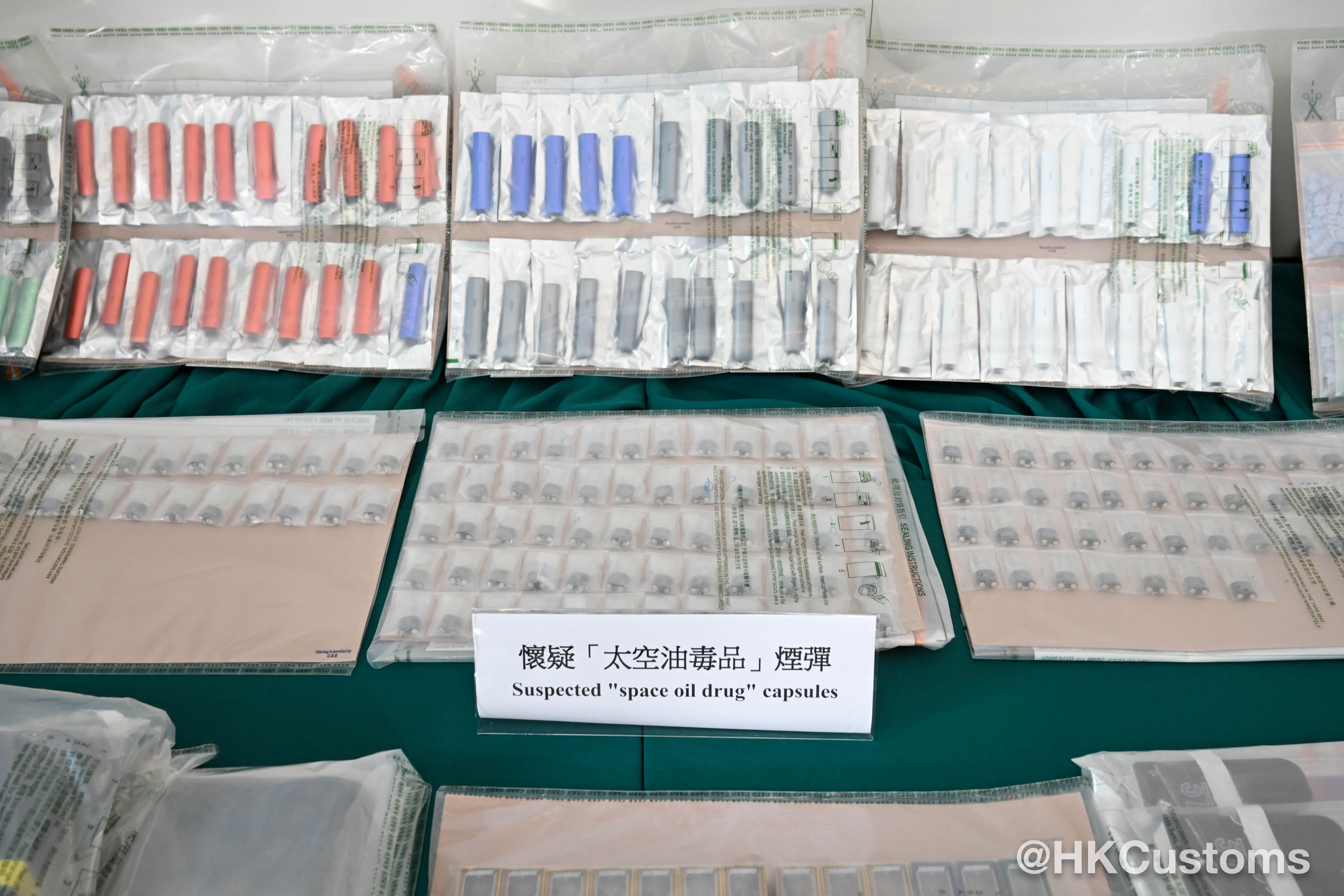 香港海關於三月三十一日在青衣檢獲五十二粒懷疑「太空油毒品」煙彈、約十克懷疑冰毒、兩支電子煙裝置、一批懷疑毒品吸食工具及包裝工具,估計市值共約二萬四千元,並拘捕三名懷疑涉案男子。
