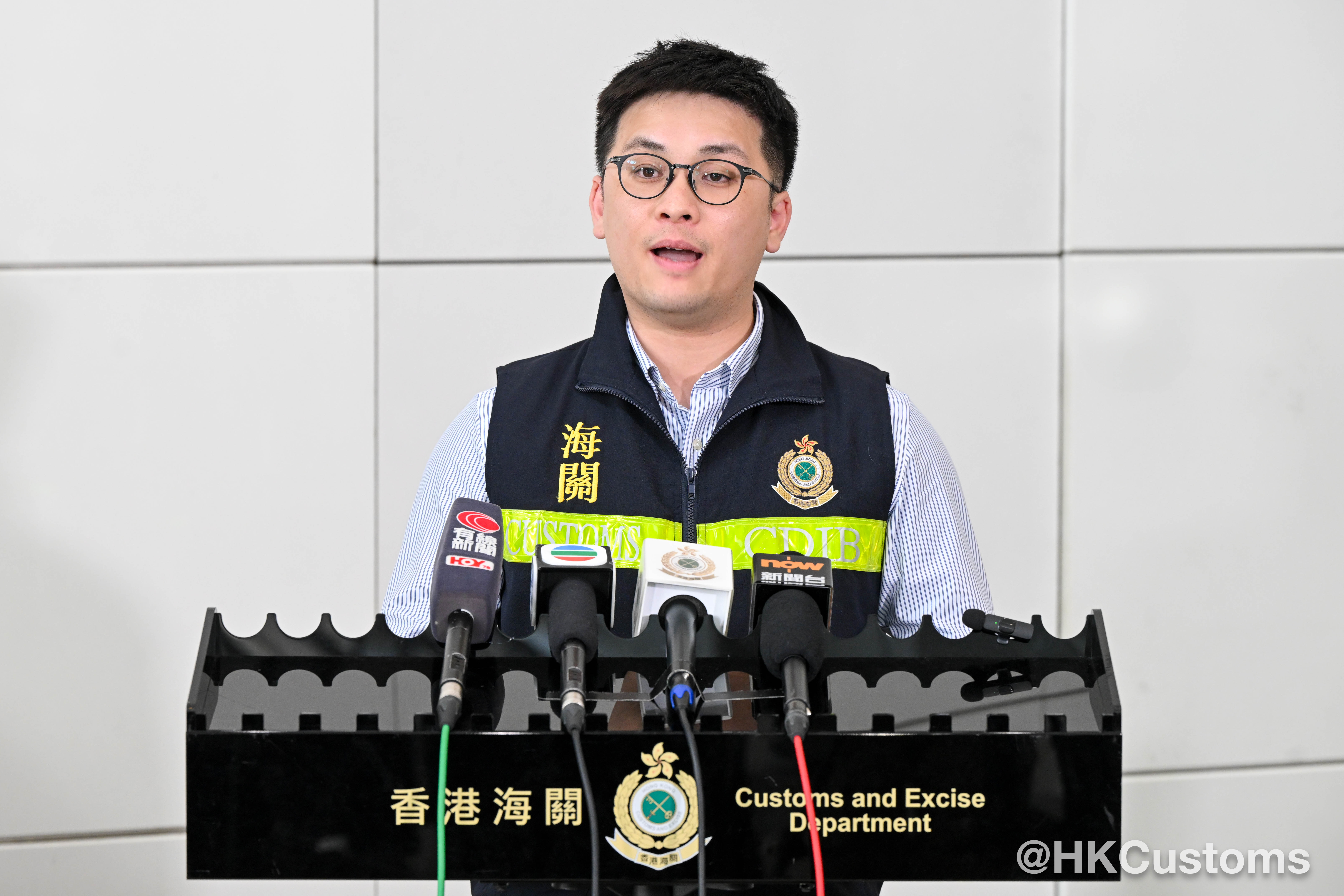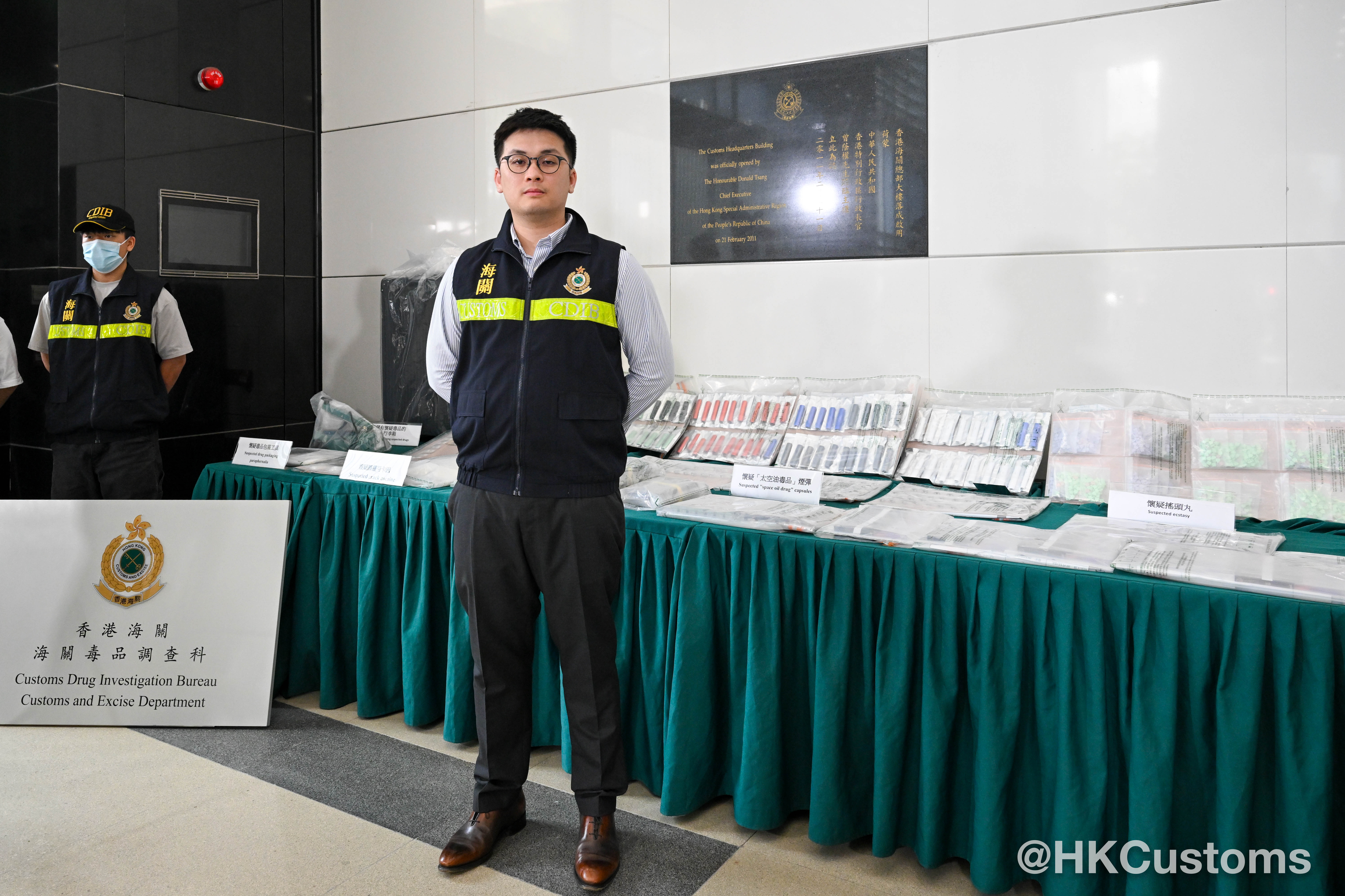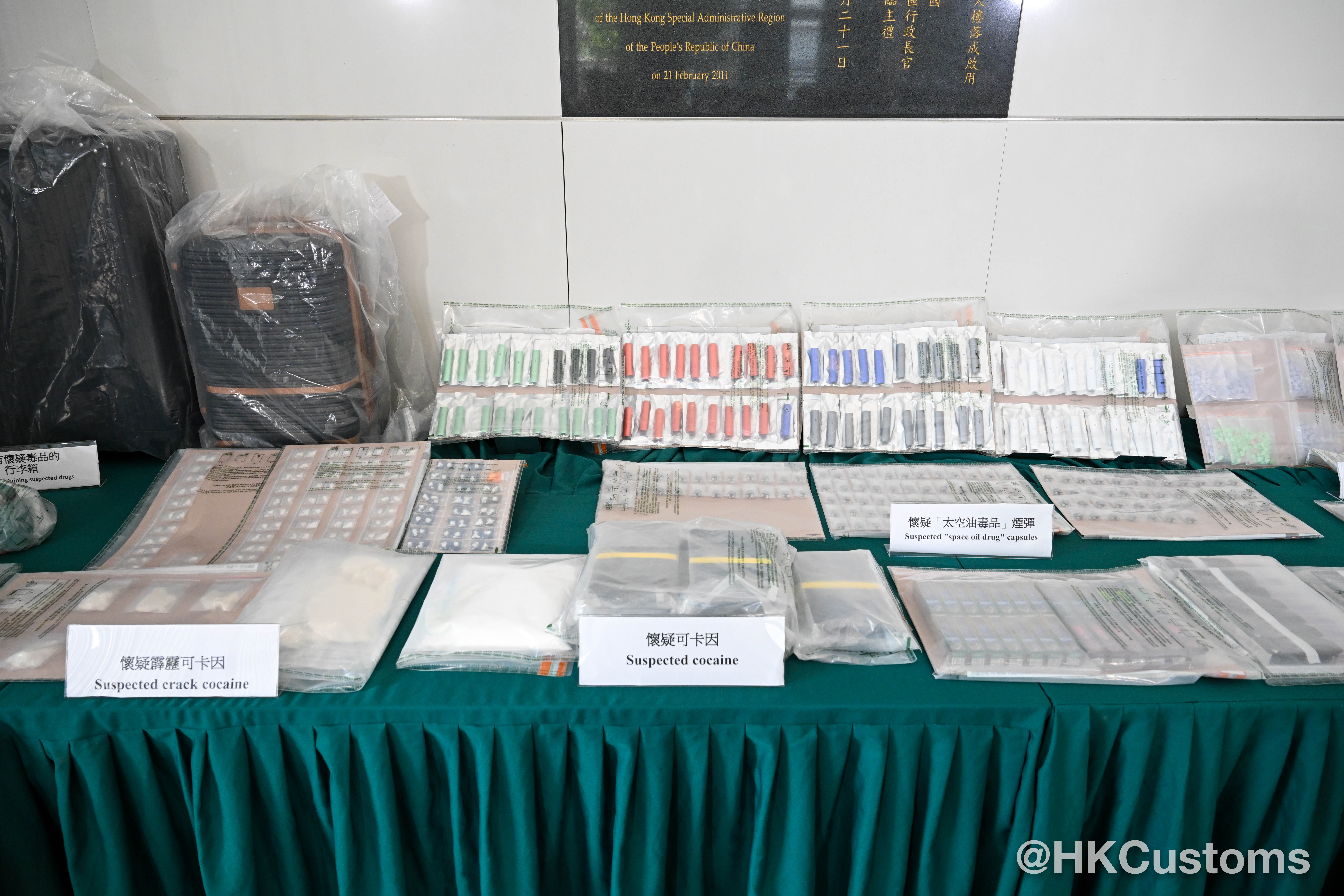 海關人員三月三十一日在青衣一帶進行緝毒行動時,截查一名三十一歲男子,並在其身上搜出兩粒懷疑「太空油毒品」煙彈及一支電子煙裝置,遂把他拘捕。其後,海關人員押解該名男子到他於附近居住的公共屋邨單位進行搜查,在單位內再檢獲五十粒懷疑「太空油毒品」煙彈、約十克懷疑冰毒、一支電子煙裝置、一批懷疑毒品吸食工具及包裝工具,並把單位內另外兩名男子拘捕,年齡分別為三十五歲和三十六歲。