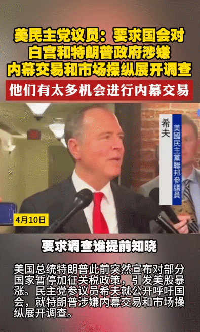 希夫說:我正在給白宮寫信,要求調查誰提前知曉總統將再次在關稅問題上改變立場,是否有人藉此套現。白宮和特朗普政府內部人員有太多機會進行內幕交易,一刻都不能對他們掉以輕心。我認為國會應該對此進行調查,但我們會要求政府給出答案。他們很可能會拖延搪塞,尤其是如果他們真的參與了腐敗的內幕交易,但他們不可能永遠把事情掩蓋住。