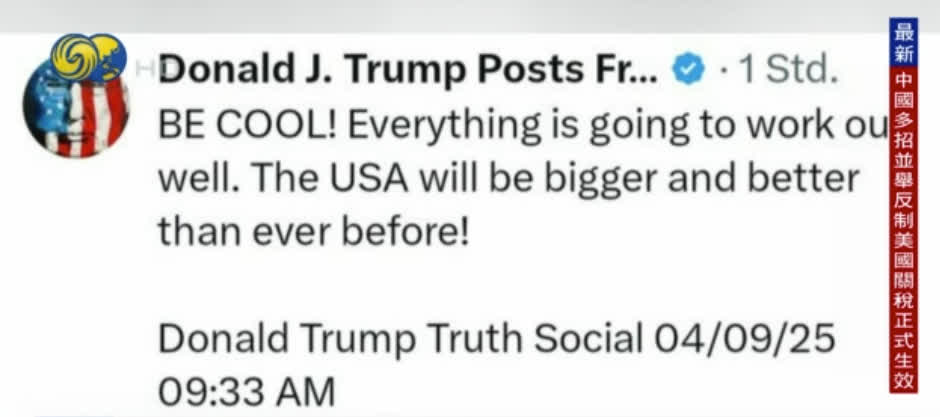 美國股市當地時間9日上午9點半開市,開市不久,特朗普就在社交媒體發文,呼籲民眾保持放鬆的心態,聲稱一切都會好起來,美國將變得前所未有的好。