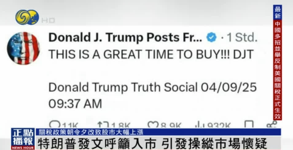 緊接着,在當天下午1點半左右,特朗普就朝令夕改,宣布了90天的暫緩執行關稅的決定。