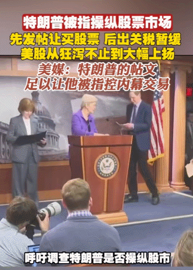 民主黨參議員沃倫呼籲調查特朗普是否操縱股市,使其華爾街的金主受益,以及特朗普是否涉及腐敗行為,通過反覆無常的關稅政策,幫助內部人士牟利。