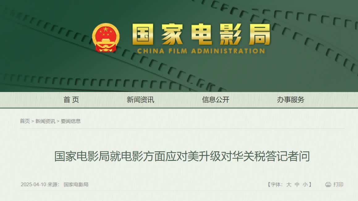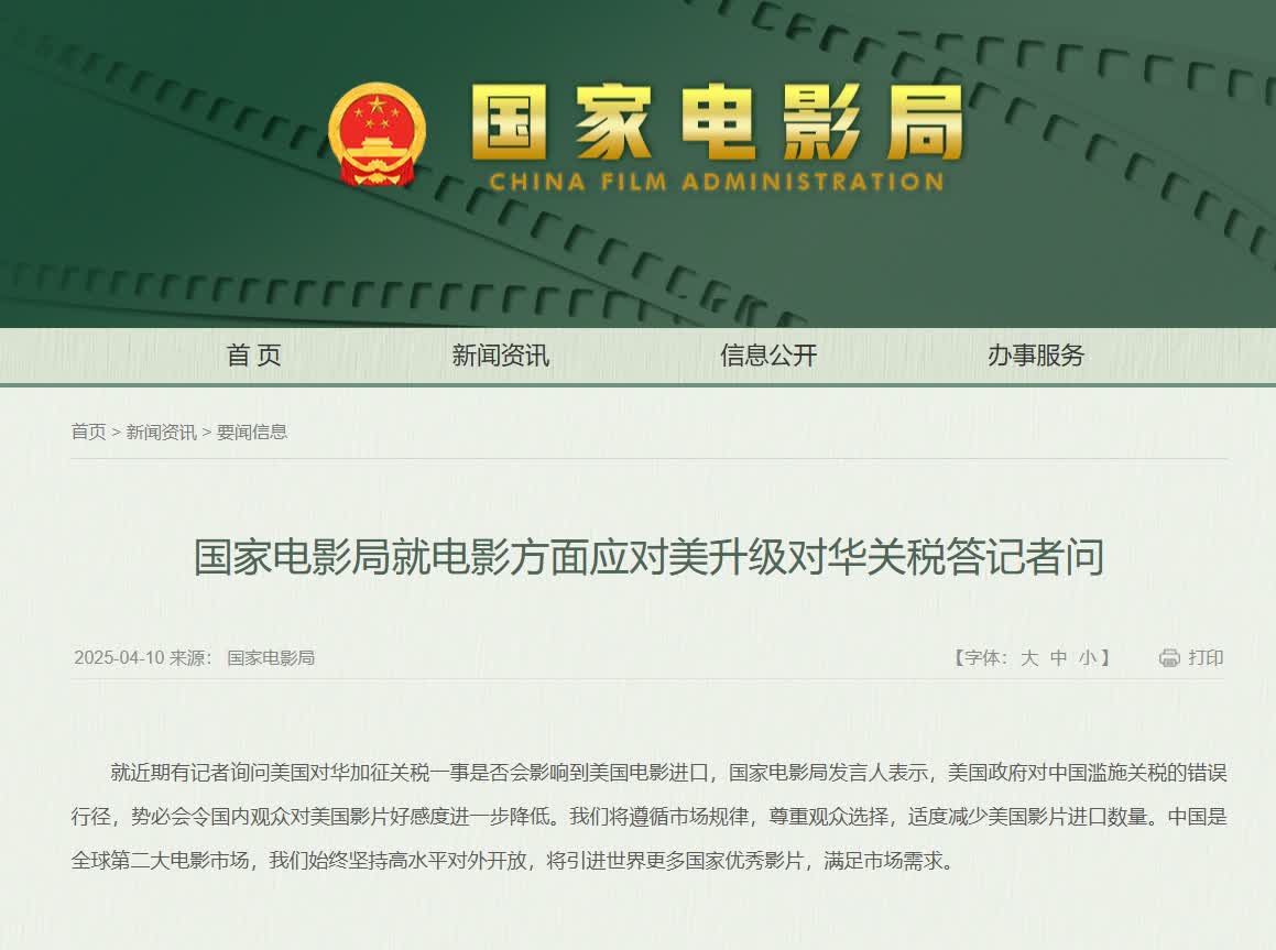 據國家電影局網站消息,就近期有記者詢問美國對華加徵關稅一事是否會影響到美國電影進口,國家電影局發言人表示,美國政府對中國濫施關稅的錯誤行徑,勢必會令國內觀眾對美國影片好感度進一步降低。我們將遵循市場規律,尊重觀眾選擇,適度減少美國影片進口數量。中國是全球第二大電影市場,我們始終堅持高水平對外開放,將引進世界更多國家優秀影片,滿足市場需求。