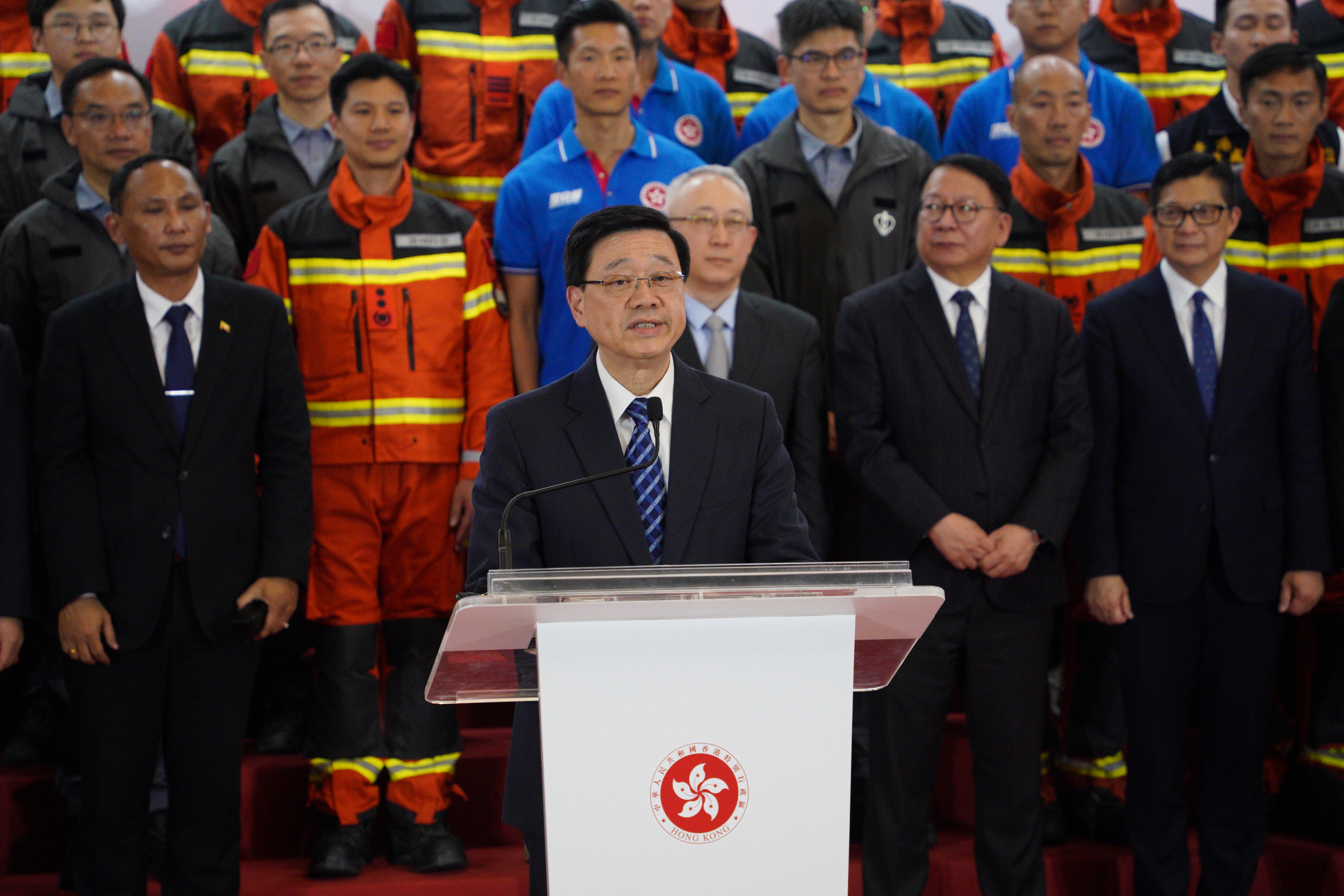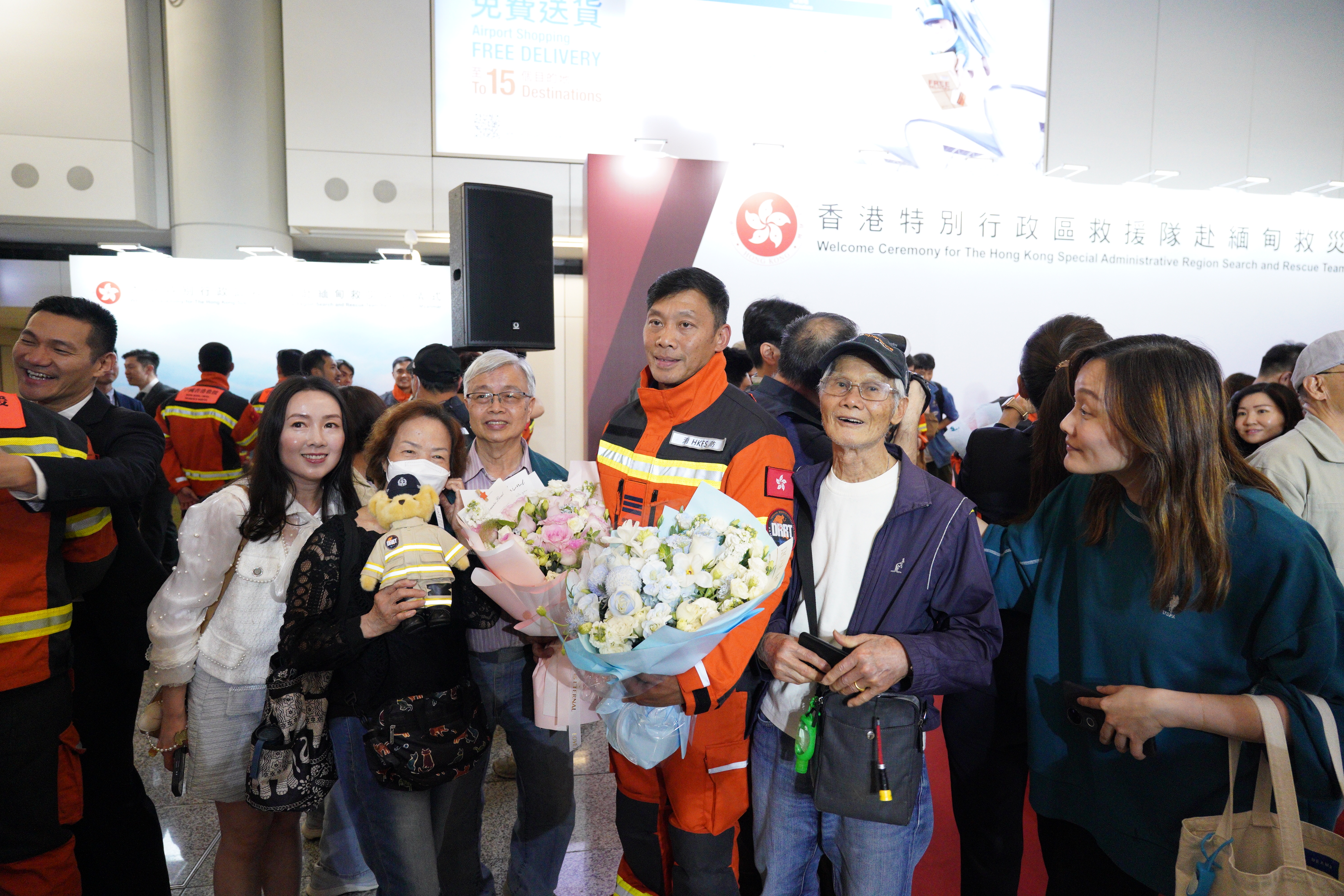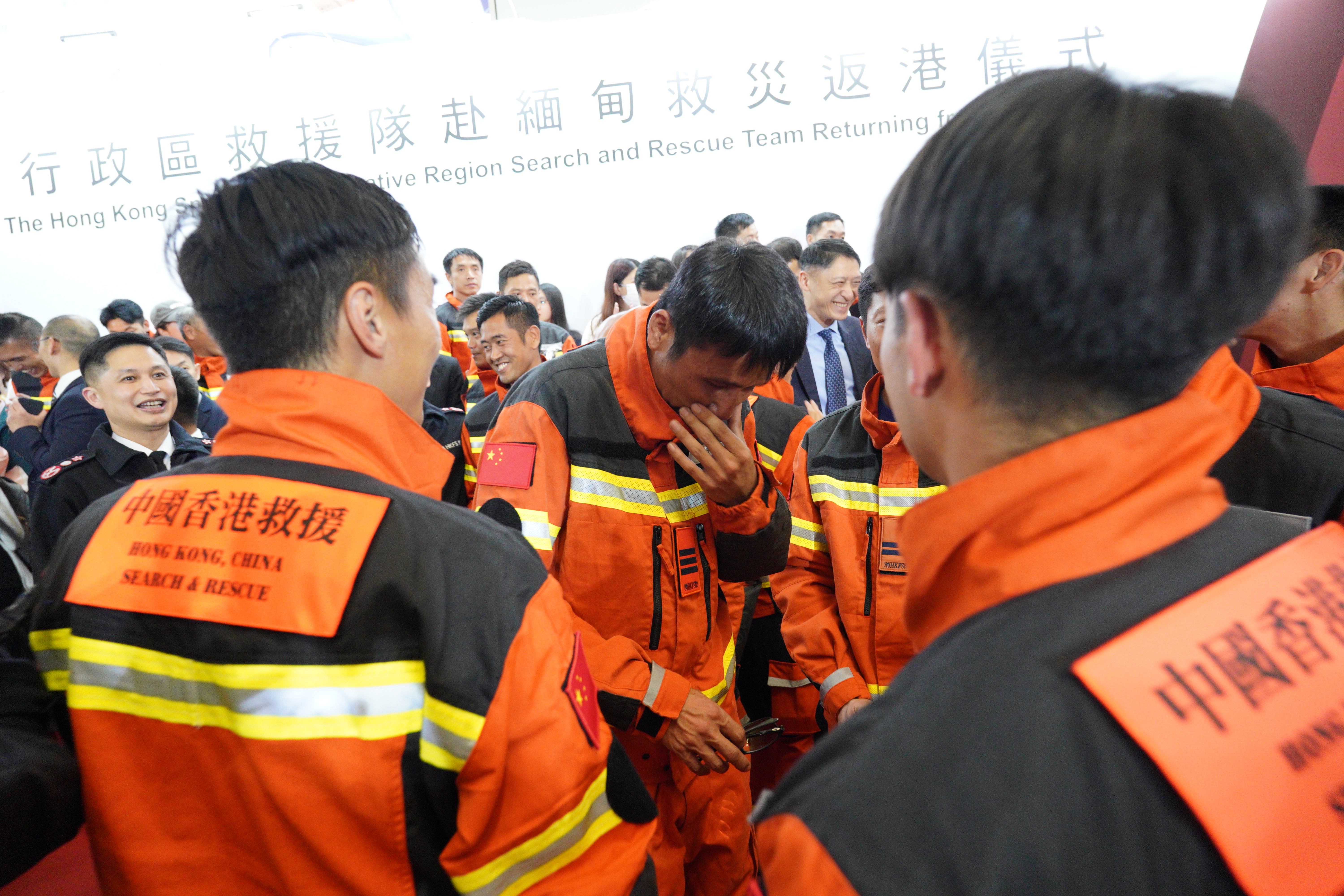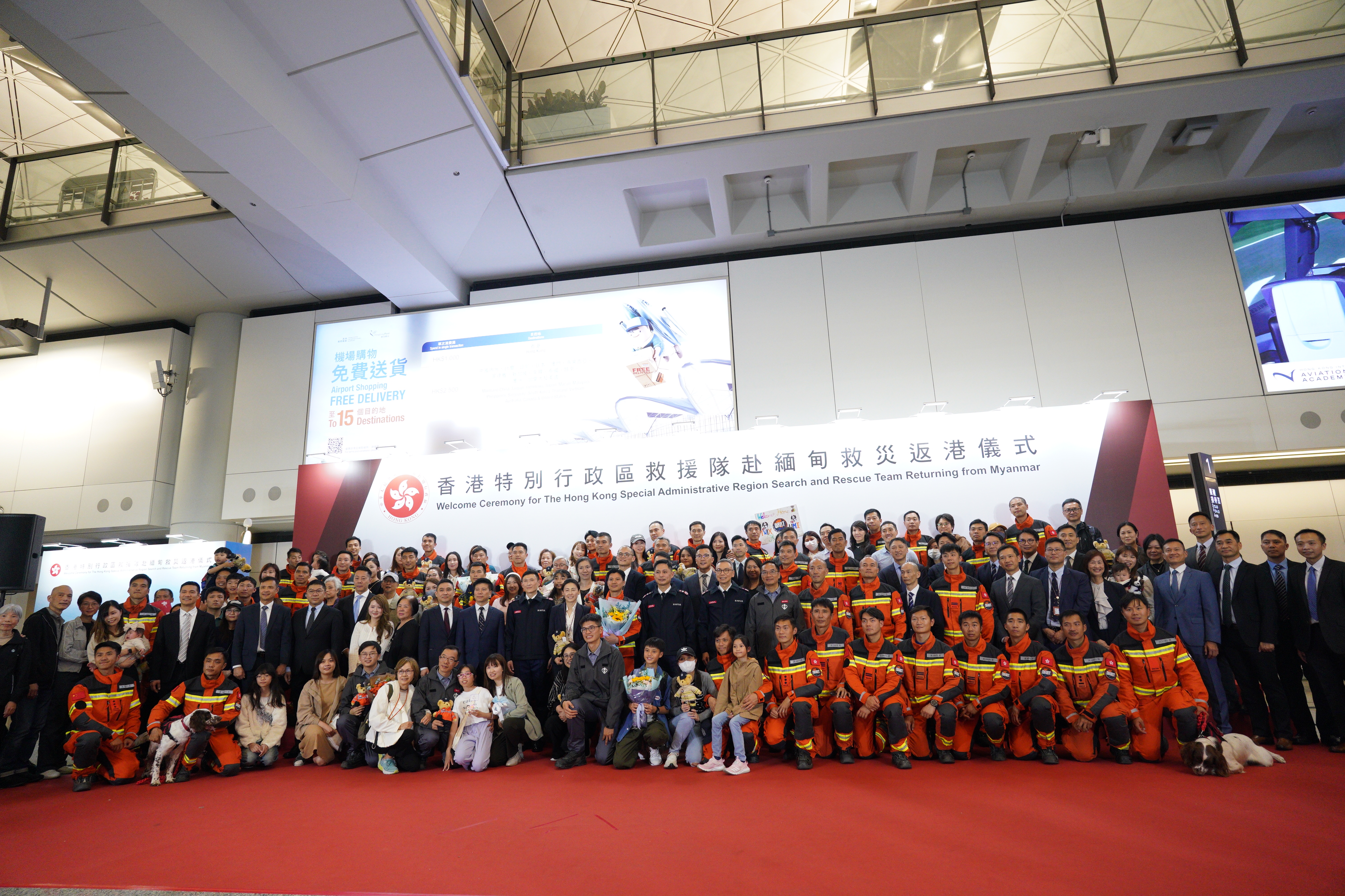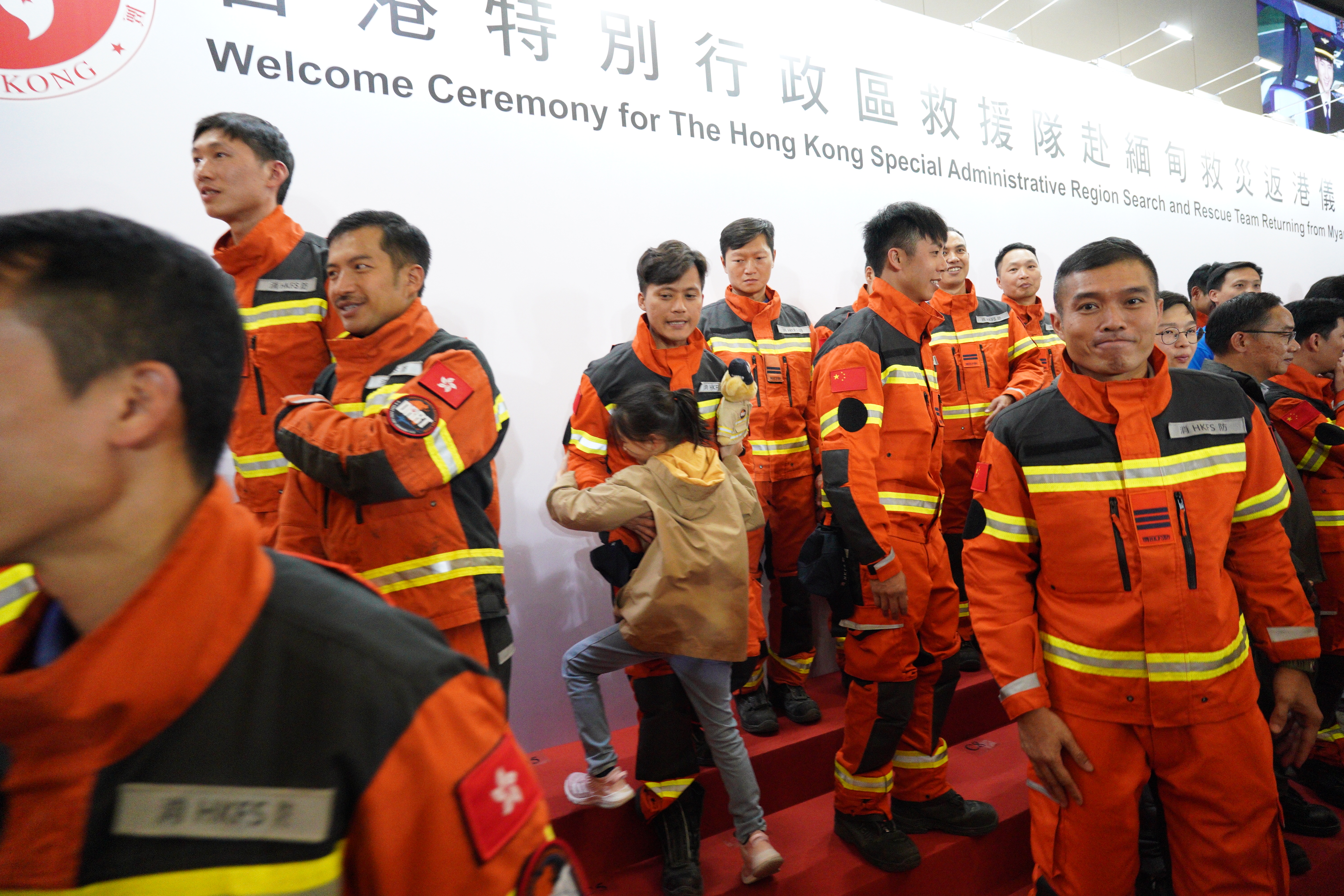 救援隊於昨日晚上10時到港,政府在香港國際機場為隊員舉行迎接儀式,行政長官李家超、政務司司長陳國基及保安局局長鄧炳強等人出席。