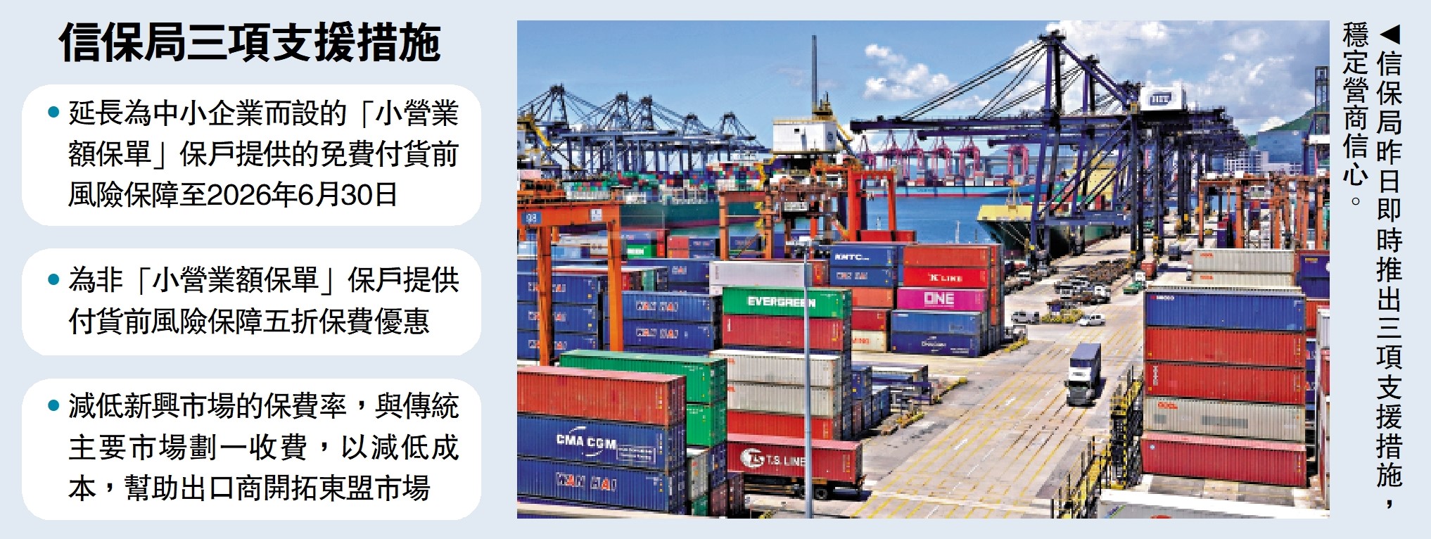 (大公報 記者 龔學鳴、李清)面對美國濫施關稅包括進一步調高所謂「對等關稅」,商務及經濟發展局昨日表示,香港出口信用保險局(信保局)即時推出三項支援香港出口貿易的措施,協助企業加快開拓新興及多元市場,支援香港企業(尤其是中小企業)應對目前挑戰。三措施包括延長合資格中小企業保戶的免費付貨前風險保障、為保戶提供付貨前風險保障五折保費優惠、減低新興市場的保費率。