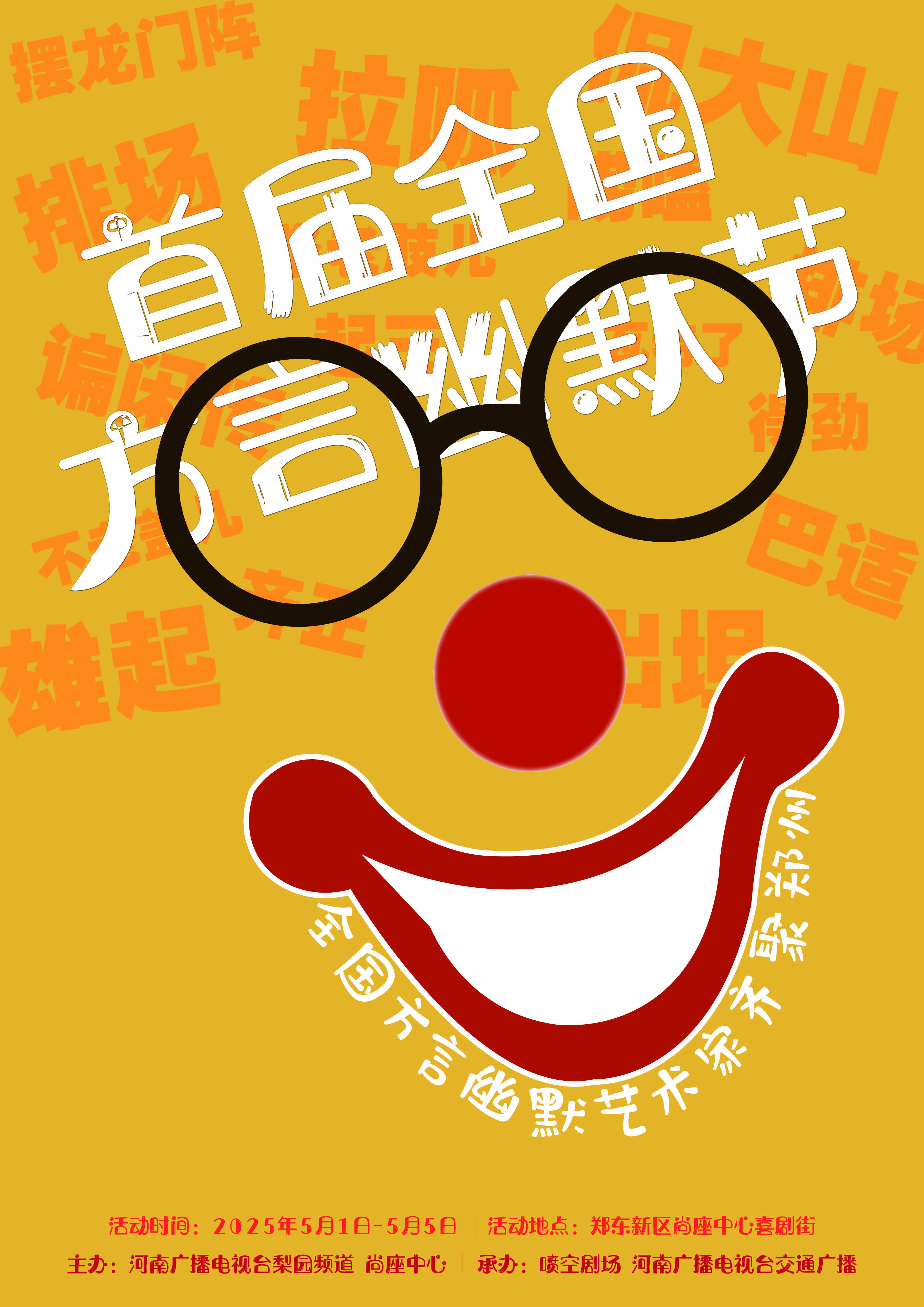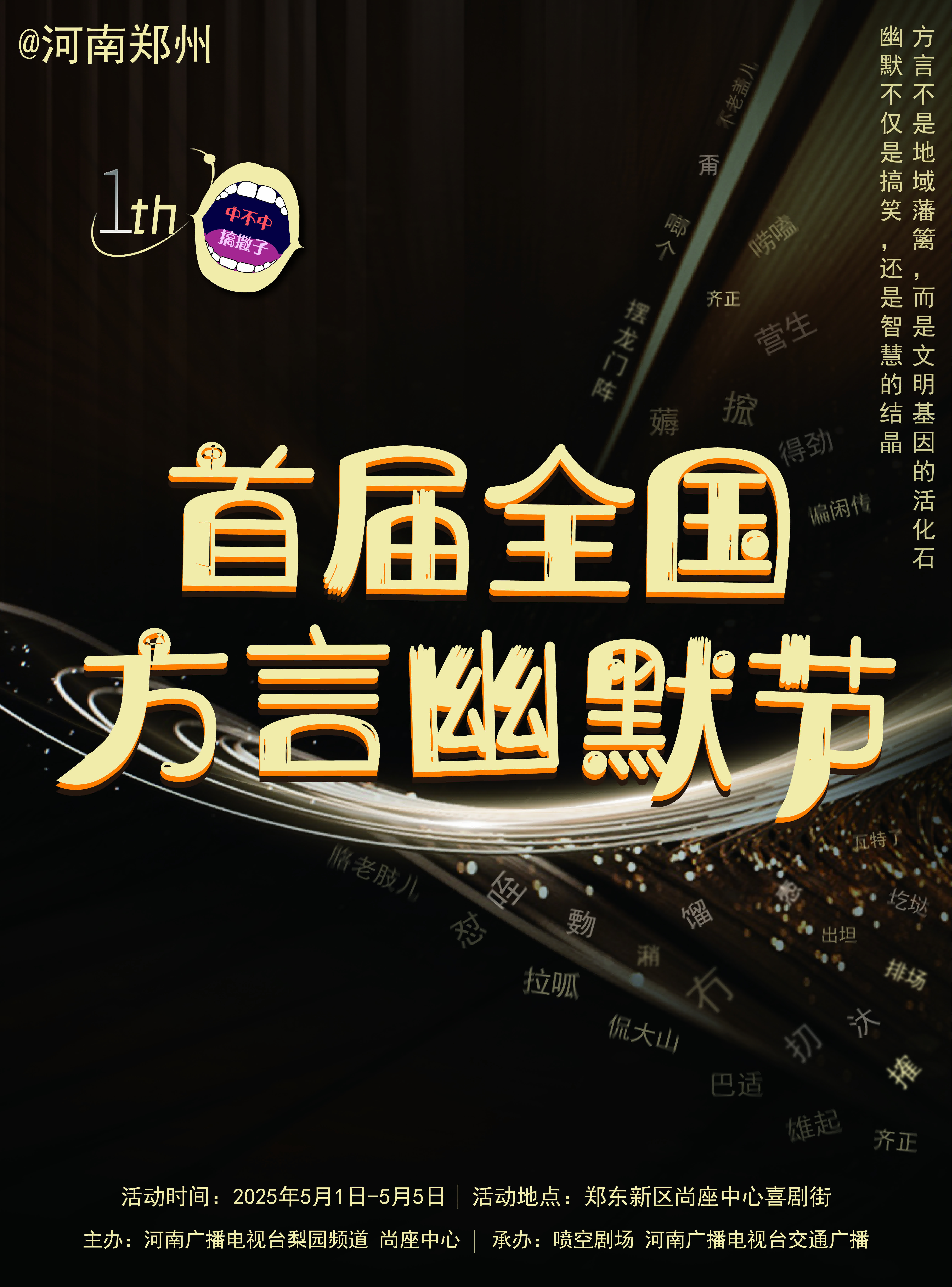 5月1日至5月5日,曾在劉曉慶版《武則天》中飾演王福來的著名影視及二人台藝術家武利平、中國曲藝家協會副主席、著名四川諧劇藝術家叮噹、曾榮登央視春晚的青年相聲演員董建春、李丁、大同數來寶創始人柴京雲、柴京海、中國曲藝家協會副主席、著名淮河琴書藝術家孟影、在《黑神話.悟空》遊戲里演唱《黃風起兮》的陝北說書演員熊竹英、青年西河大鼓演員張麗靜、上海滑稽戲演員徐秉輝以及河南本土的白軍選、秦夢瑤、趙文心、餘澤洋、何瑤、王金龍等齊聚首屆方言幽默節;中原文化新名片噴空的創始人也是全國方言幽默節發起人陳紅旭攜噴空劇場全體演員和東、西、南、北、中全國各地方言幽默藝術家以及河南十八地市方言達人匯聚鄭東新區尚座中心喜劇街,以公益的形式,連續五天從上午11點至晚上10點,為鄭州市民上演100場的幽默大餐。