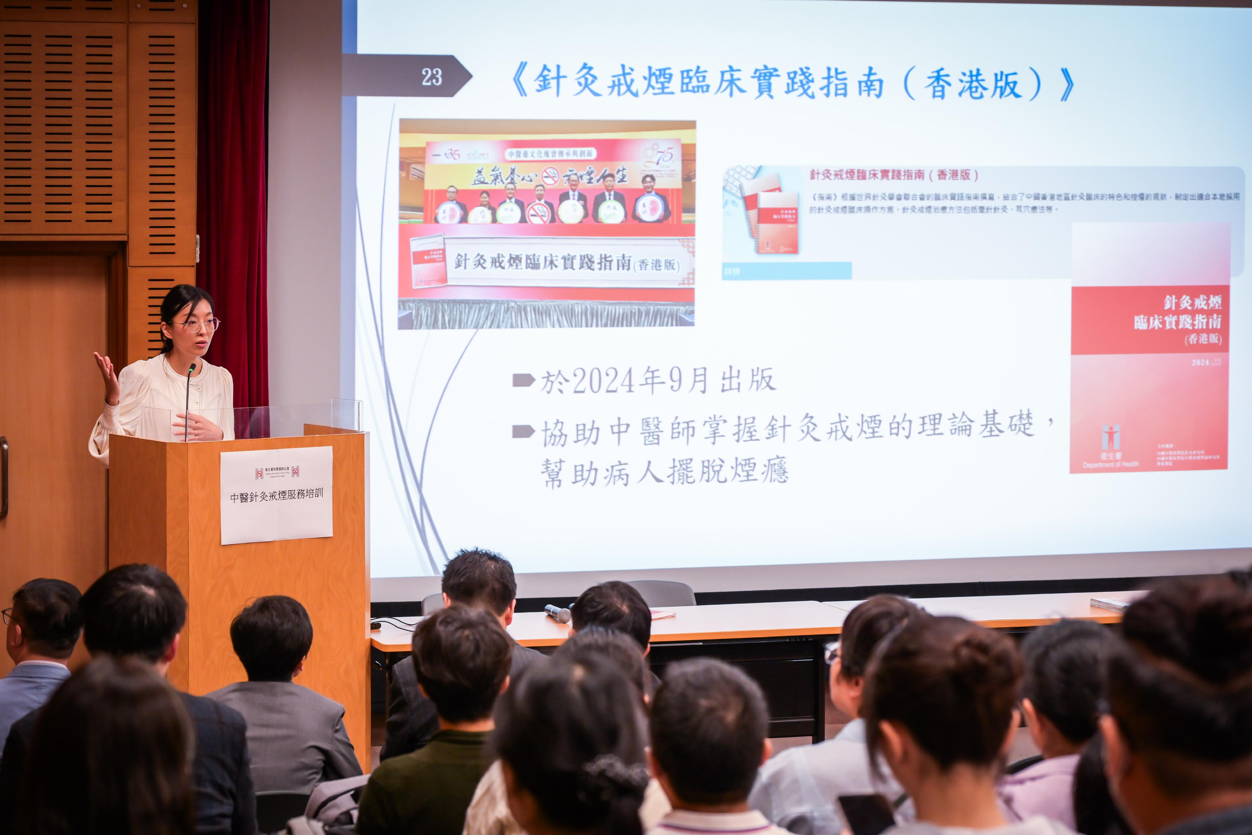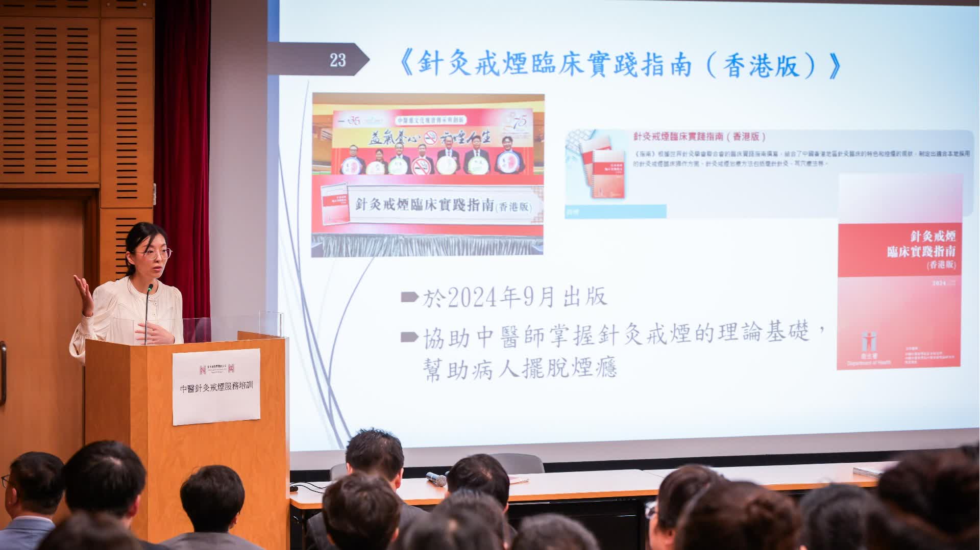 衞生署自二○一二年獲世界衞生組織(世衞)指定為世衞控煙及煙癮治療合作中心後,成為支援戒煙培訓工作的區域樞紐,定期為本地、內地,以至整個西太平洋地區的醫護人員,提供戒煙治療的訓練。今日的培訓班,內容豐富,包括戒煙輔導、中醫戒煙的機理和治療方案及針灸和耳穴療法示範等,協助前線中醫師進一步提升戒煙知識及技能。參加是次培訓班的前線中醫師中,約80名來自內地和澳門。
